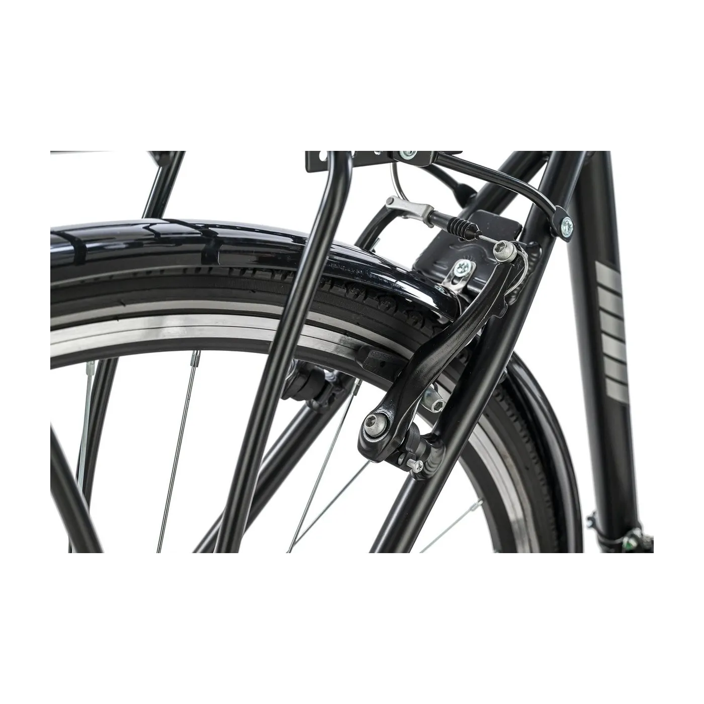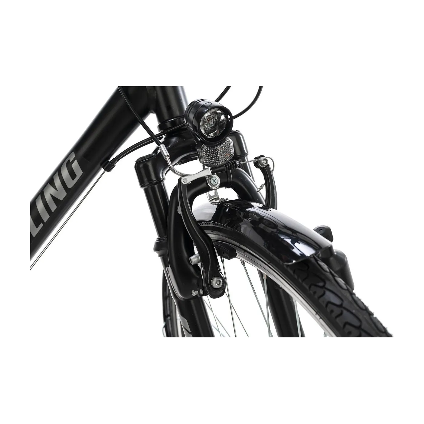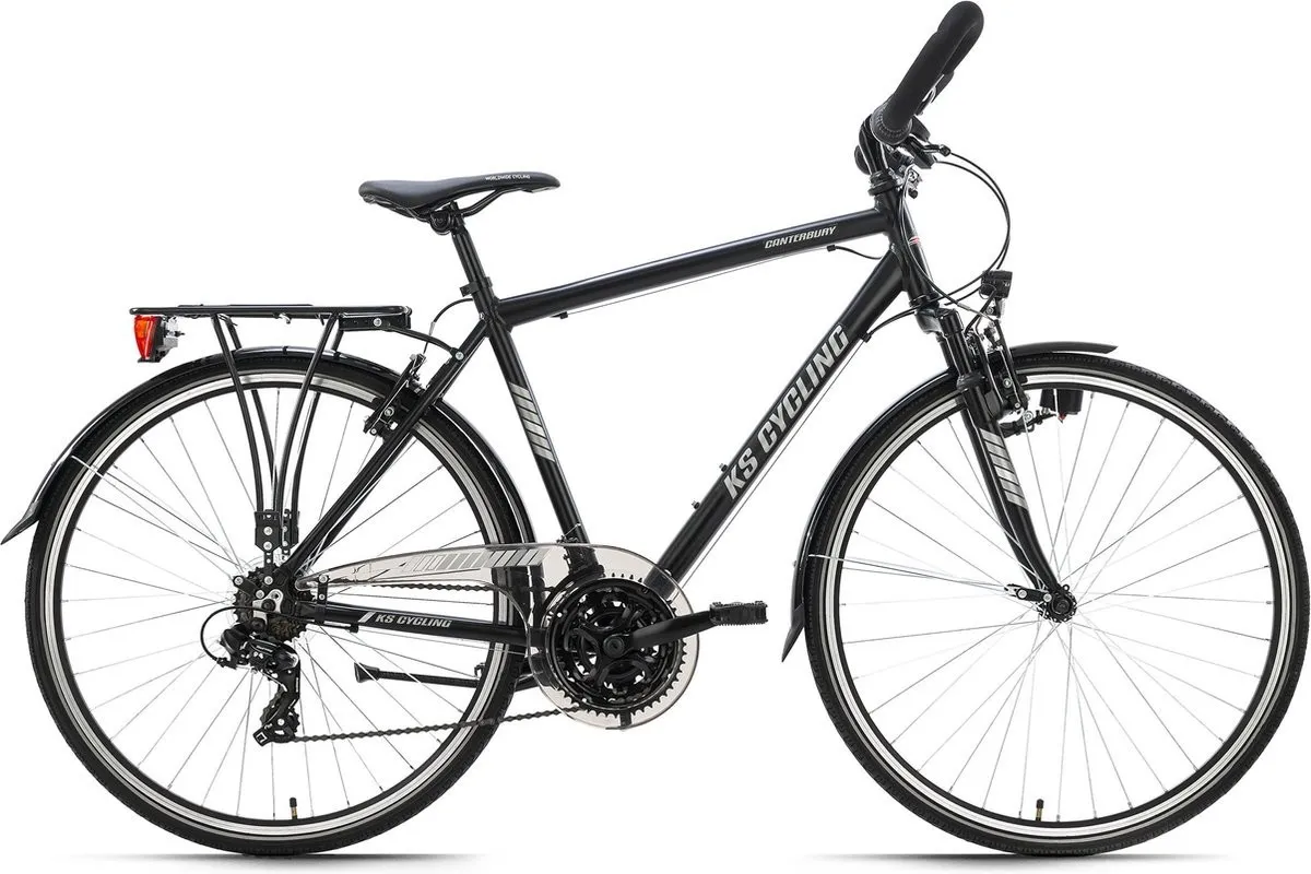 Elastyczny, sportowy towarzysz o wszechstronnych właściwościach: 28-calowy rower trekkingowy Canterbury firmy KS Cycling sprosta najróżniejszym wyzwaniom, od szybkiej jazdy po mieście, przez dłuższy trening aż po długie trasy! Czarna rama wykonana z aluminium połączona z delikatnymi szarymi detalami. Przezroczysta osłona łańcucha i wielopozycyjna kierownica dopełniają całości.