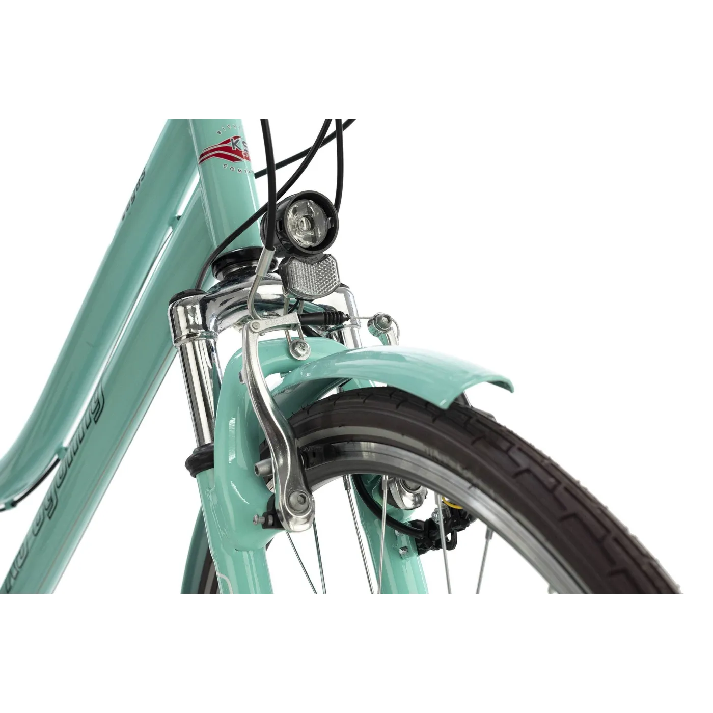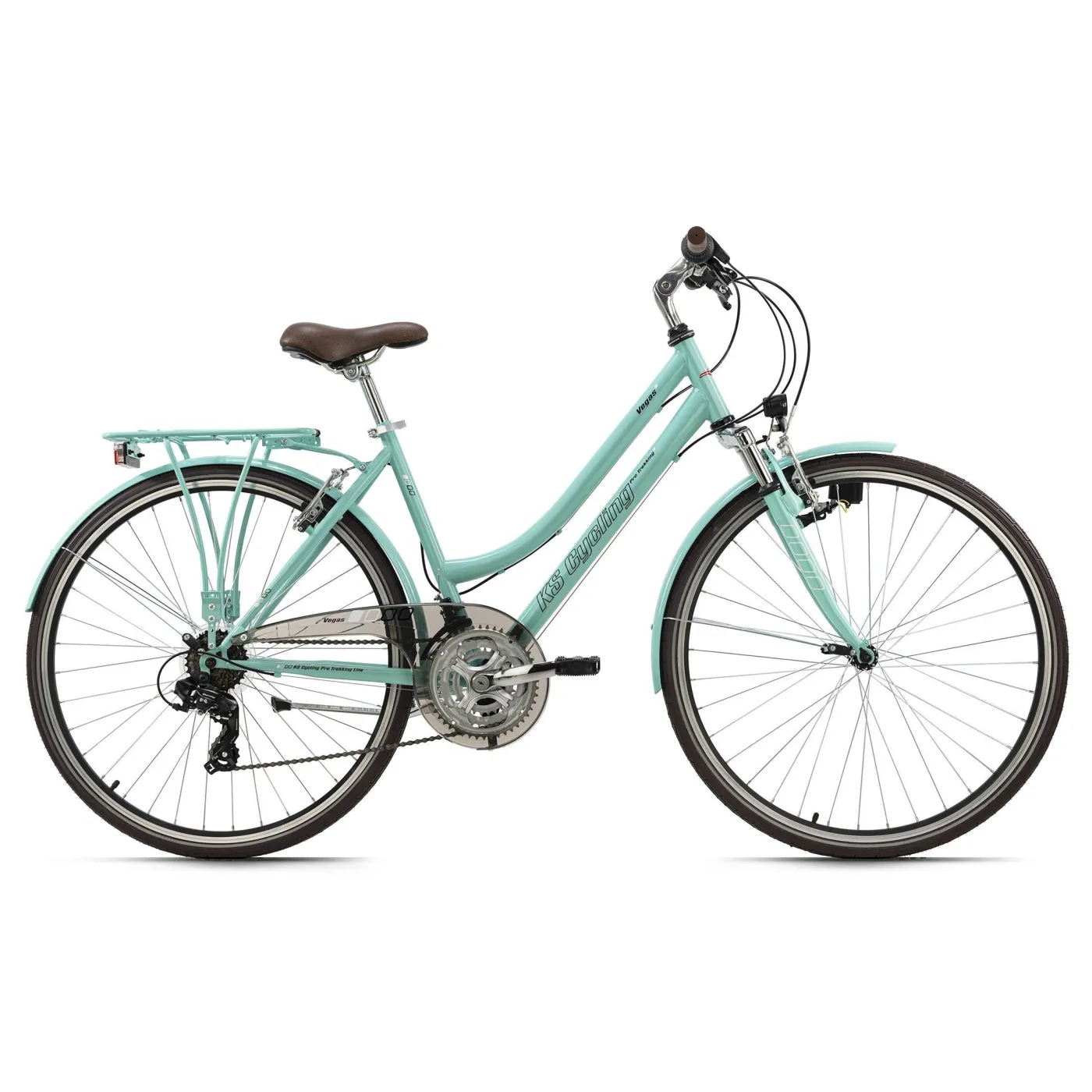 Solidne wykonanie i świetne wyposażenie charakteryzuje rower trekkingowy Vegas. Posiada 21 biegów Shimano oraz hamulce V-brake oraz wygodne siodełko, co pozwoli komfortowo i bezpiecznie przemierzyć długą trasę. Dodatkowe komponenty tj. bagażnik, oświetlenie zasilane przez dynamo oraz podnóżka umilą podróżowanie. Miętowa rama z brązowymi dodatkami to świetne połączenie klasyki ze sportowym stylem.