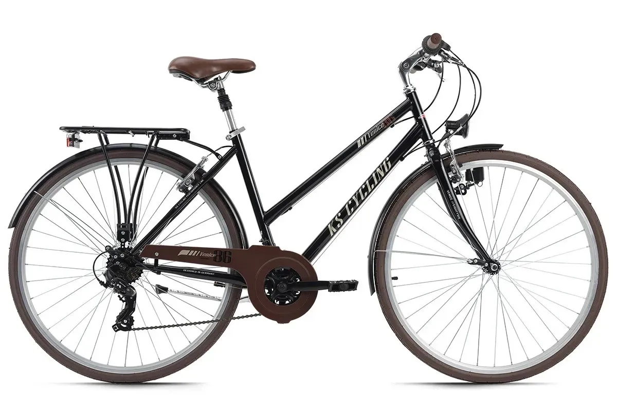 Niezależnie od tego, czy chcesz wygodnie jeździć po mieście, czy planujesz dłuższą wycieczkę: 28-calowy trekkingowy damski rower VENICE firmy KS Cycling jest zawsze z Tobą! Rower ma czarną ramę z eleganckimi detalami. Zawiera również opony, osłonę łańcucha, siodełko i uchwyty, które dopełniają wzór.