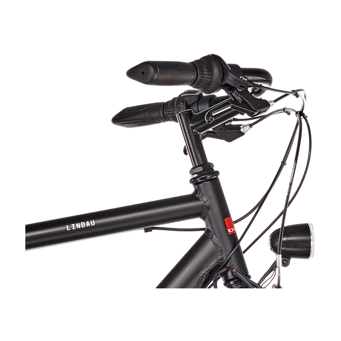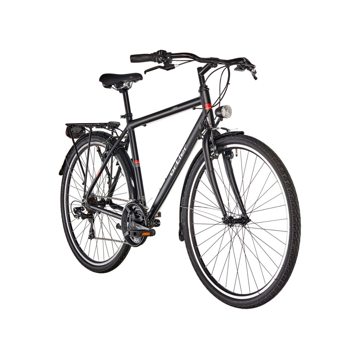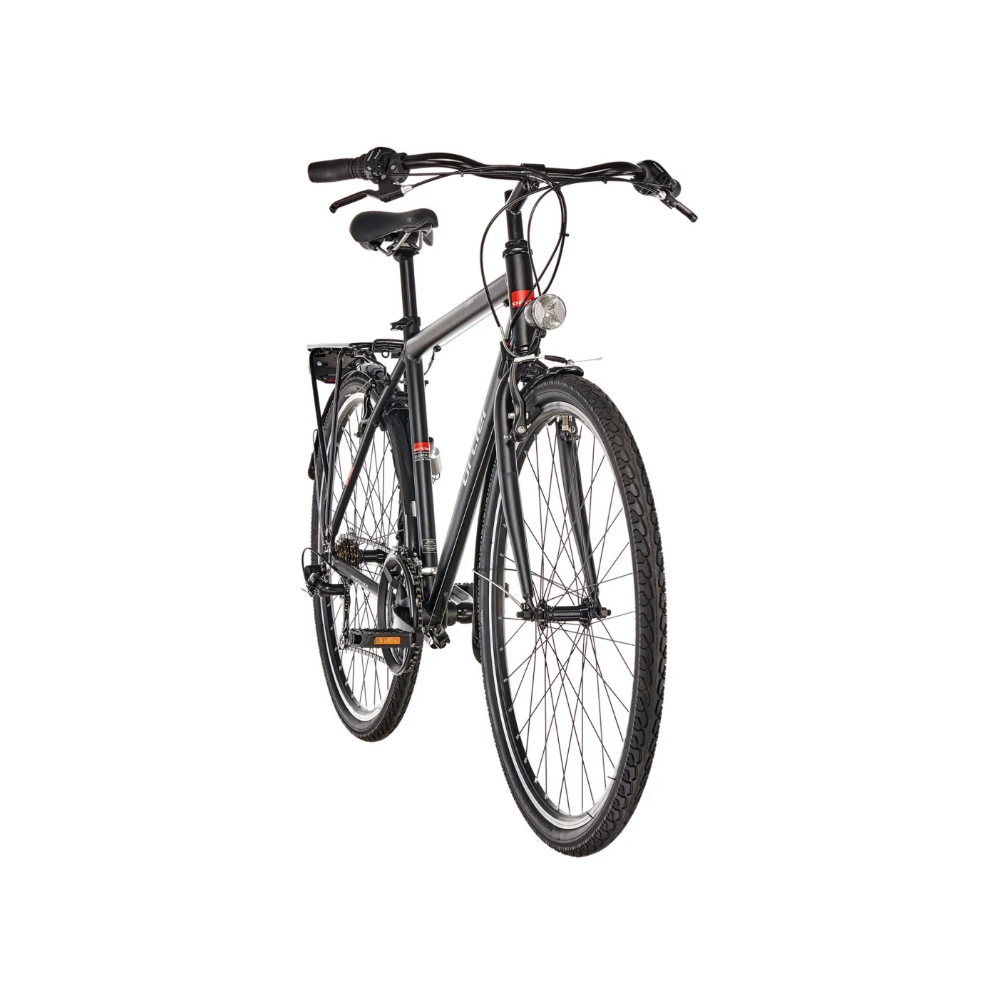 OpisLekka, aluminiowa rama, szerokie siodełko i profilowana kierownica zapewniają wyprostowaną pozycję i wygodę jazdy. 21 biegowe przerzutki Shimano zapewniają lekkość jazdy po trudniejszym terenie i szybkość na prostych drogach. Rower wyposażony jest w hamulce szczękowe V-brake, posiada również oświetlenie, bagażnik, stopkę, błotniki i dzwonek. Przy takim osprzęcie i akcesoriach waży zaledwie około 16 kg!