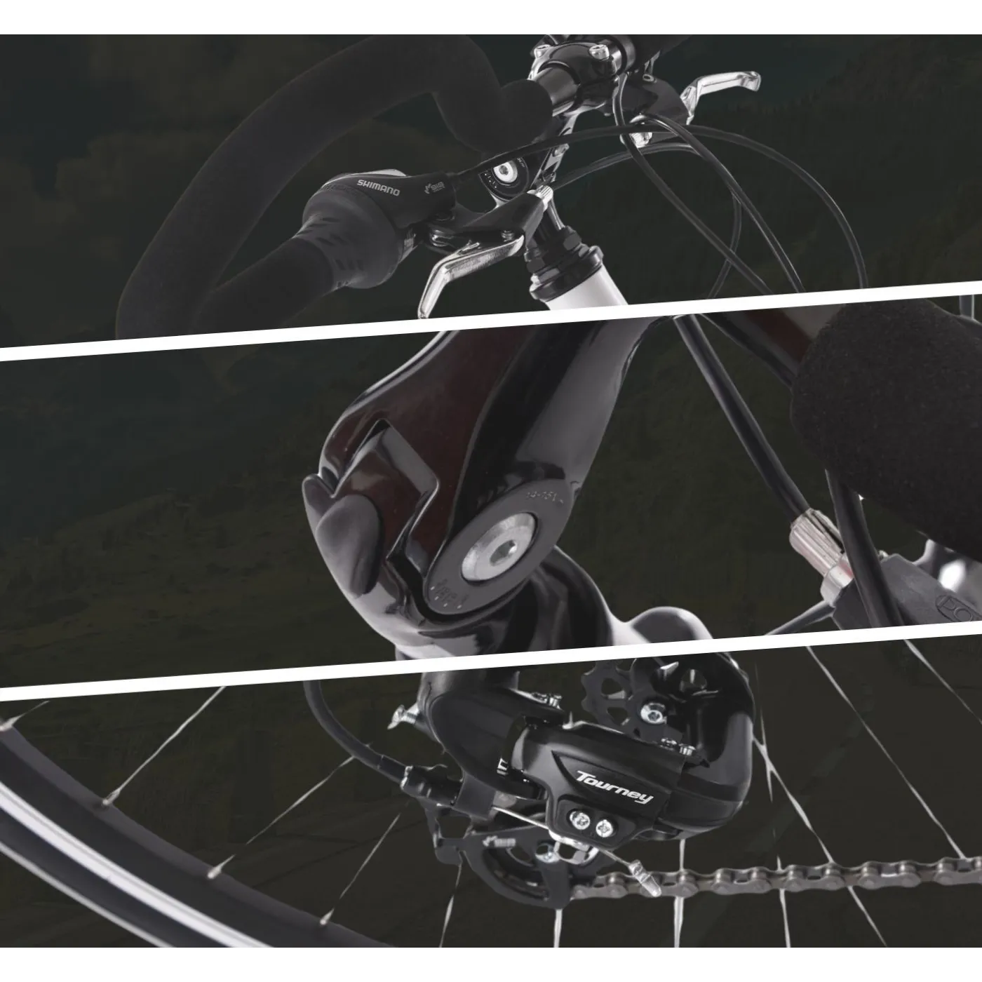 👌 Przerzutka Shimano z 21 biegami oraz manetki obrotowe Revoshift pozwalają na płynne i precyzyjne zmiany przełożeń, co ułatwia pokonywanie różnego rodzaju wzniesień. Opony w rozmiarze 28" 700 x 35C gwarantują dobry kompromis pomiędzy stabilnością a przyczepnością, co sprawia, że rower doskonale sprawdza się zarówno na szosach, jak i na lekko wyboistych trasach.