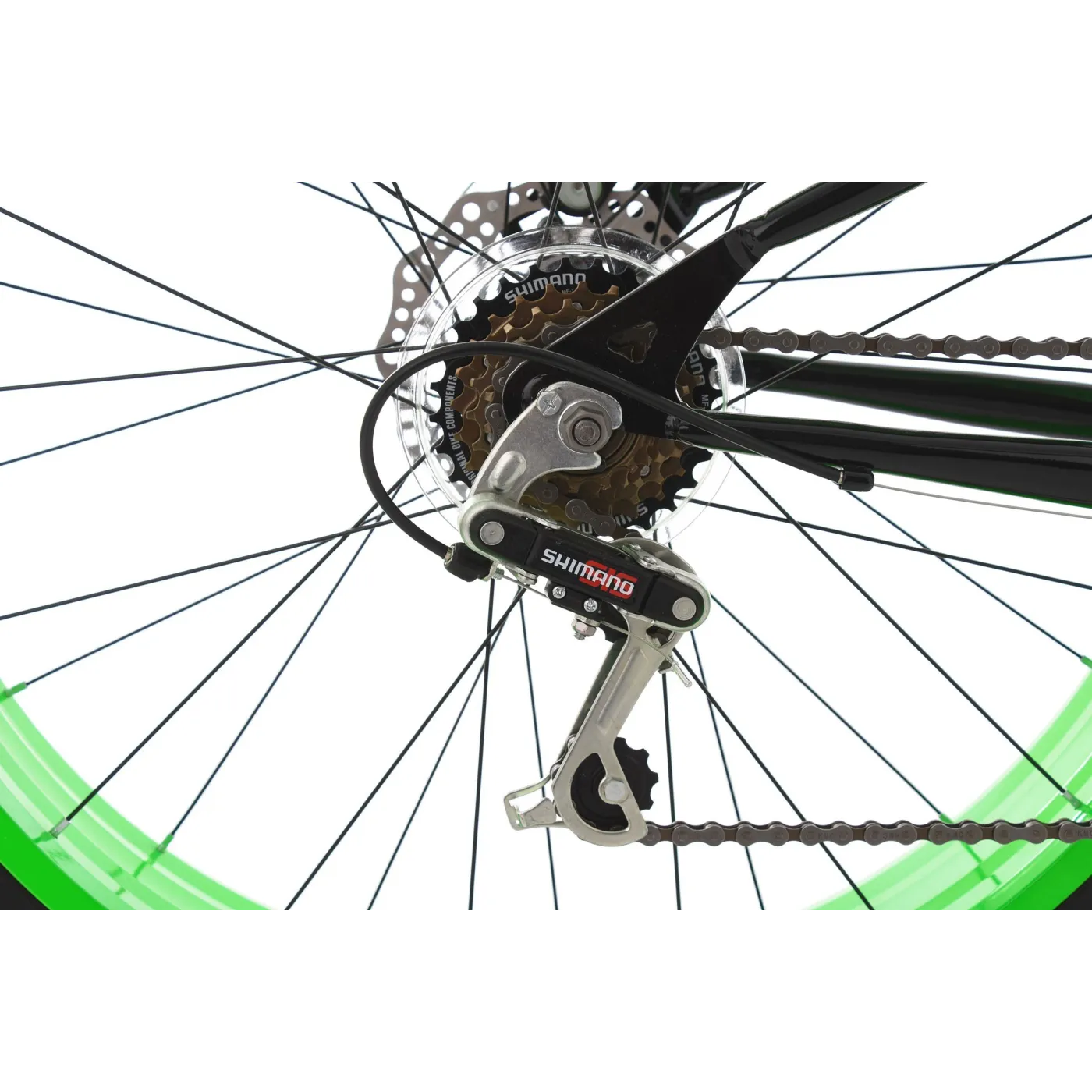 Fatbike SNW2458 jest przeznaczony do ekstremalnych warunków i można go używać wszędzie! Trakcja na trudnych nawierzchniach takich jak piasek, błoto czy śnieg jest niesamowita i nie stanowi już problemu ze względu na grube opony, niemniej opory toczenia na normalnym terenie są zaskakująco niskie. Za amortyzację roweru świetnie odpowiadają szerokie opony. Rower wyposażony jest w 6-biegową skrzynię biegów SHIMANO. Do zwalniania używane są mechaniczne hamulce tarczowe.