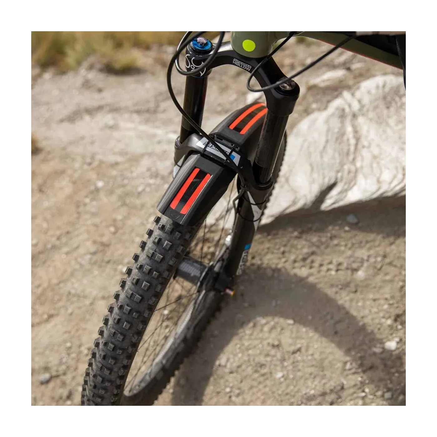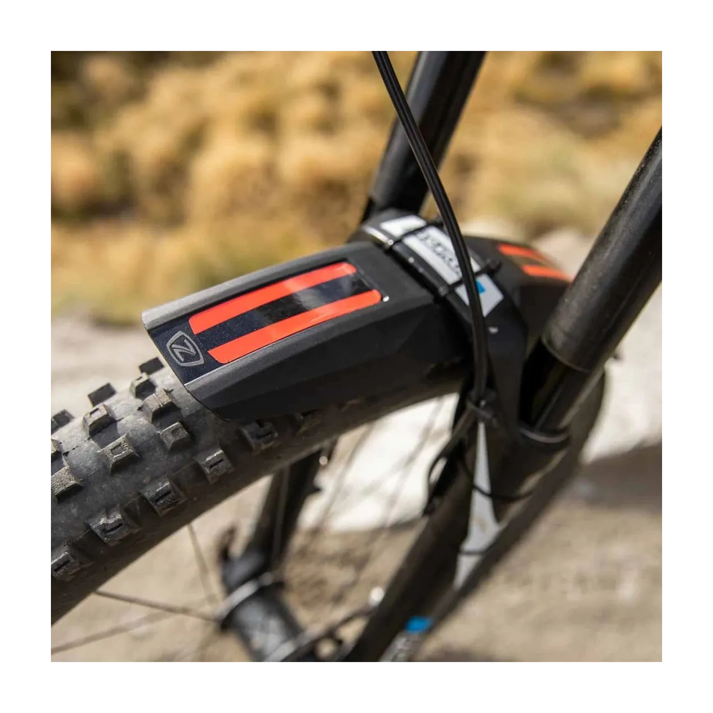 Solidny przedni błotnik MTB Zéfal Deflector FM30 niezawodnie chroni przed błotem i brudem. Błotnik przedniego koła można łatwo przymocować do większości widelców amortyzowanych za pomocą opasek kablowych znajdujących się w zestawie. Jest przymocowany do łuku dolnej części nogi i górnych rur, aby zapewnić bezpieczne trzymanie w każdej sytuacji. Dołączone tulejki ochronne do opasek kablowych, które można przyciąć na odpowiednią długość, zapobiegają zarysowaniom i zapewniają dodatkowy chwyt dzięki antypoślizgowej powierzchni. W przeciwieństwie do Zéfal Deflector FM20, Deflector FM30 ma dwa dodatkowe mocowania opasek kablowych, co daje w sumie sześć. Jest także szerszy i dłuższy, co zapewnia lepszą ochronę opon o szerokości do 3 cali.