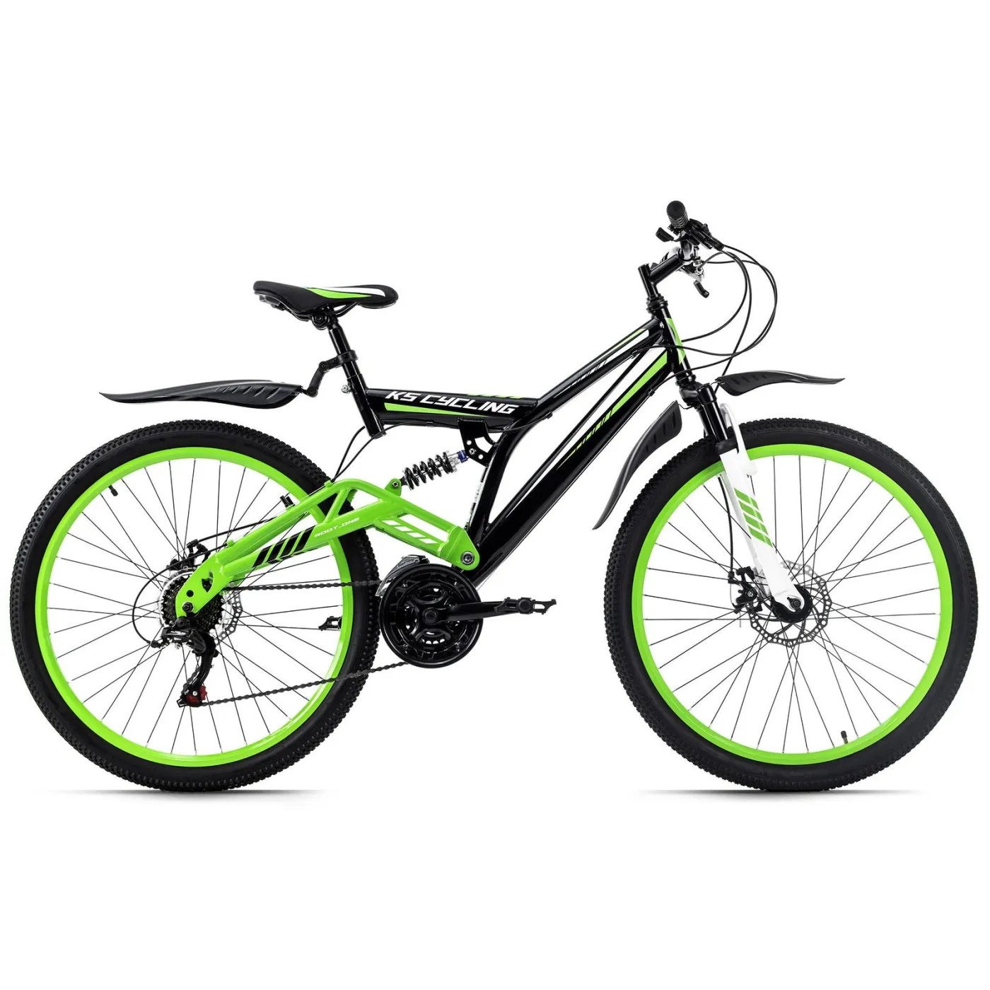 Rower górski KS Cycling 26" ROOT ONE z pełnym zawieszeniem to idealny rower dla początkujących rowerzystów górskich! Rama jest czarna, biały widelec i oczywiście fajny kształt ramy zapewniają przyciągający wzrok efekt.