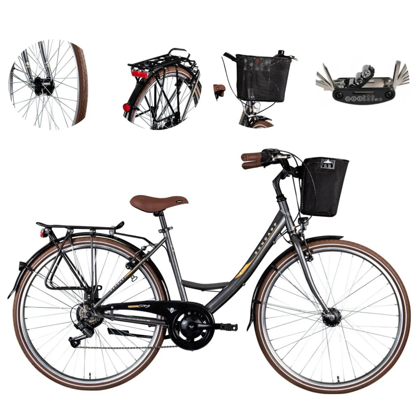 ✨ Błotniki chronią przed brudem drogowym, osłona łańcucha, bagażnik i przedni kosz zapewniają dużo miejsca do przechowywania, na przykład na zakupy. Kosz jest przymocowany do kierownicy za pomocą systemu zatrzaskowego i można go wyjąć w kilka sekund i łatwo zabrać ze sobą dzięki rączce.