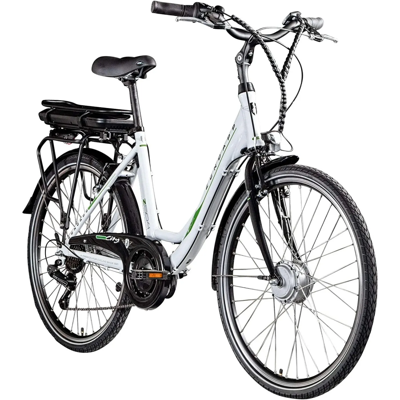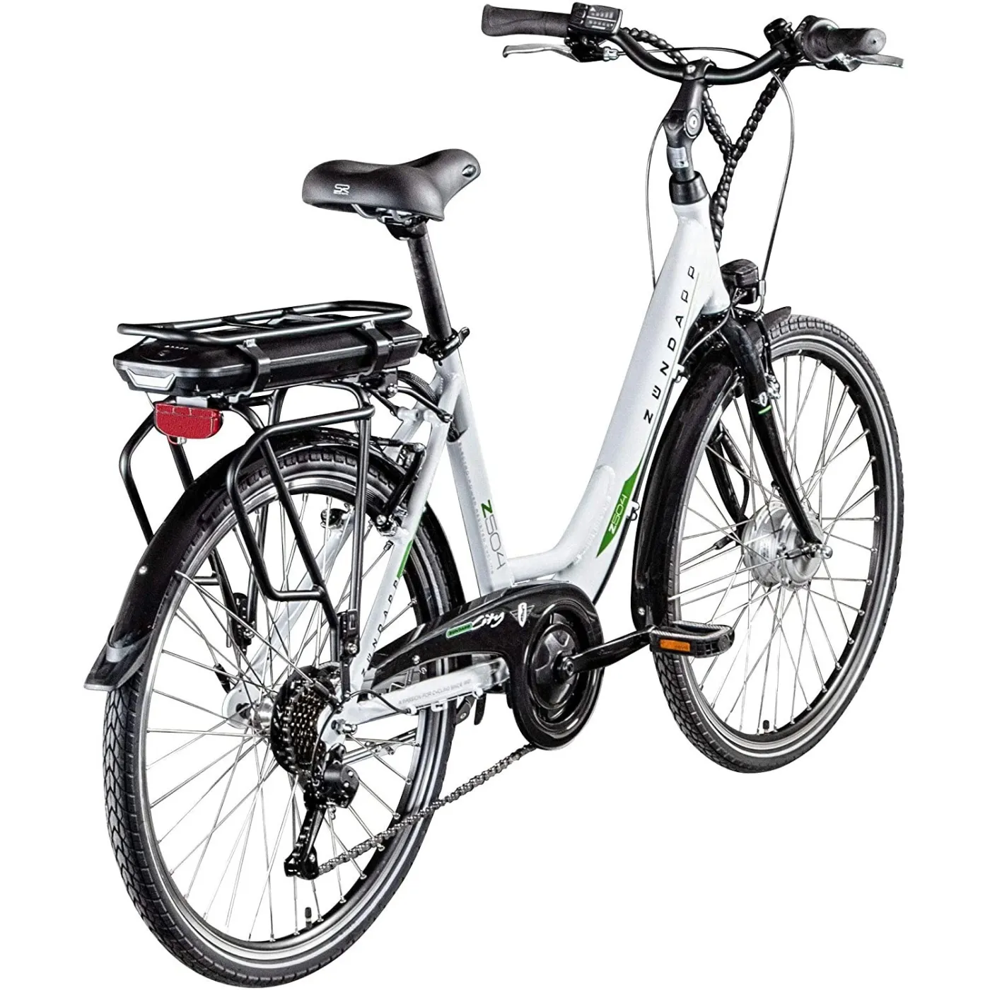 Rama Z504 jest wykonana z wytrzymałego aluminium, a niskie wejście ułatwia wsiadanie i wysiadanie. Wyprostowana pozycja siedząca dzięki wygiętej kierownicy i regulowanemu wspornikowi, wygodne siodełko i ergonomicznie ukształtowane uchwyty zapewniają duży komfort jazdy. Dzięki bogatemu wyposażeniu w oświetlenie zgodne z StVZO, bagażnik, błotniki, stopkę boczną i osłonę łańcucha oraz blokadę, Z504 jest już dobrze przygotowany do użytku. Elektryczny napęd składa się z silnika piasty koła Ananda umieszczonego na tylnym kole, który zapewnia mocne wsparcie w trzech etapach z mocą 250 W. Wyświetlacz pokazuje tryby jazdy i poziom naładowania baterii za pomocą diod LED.