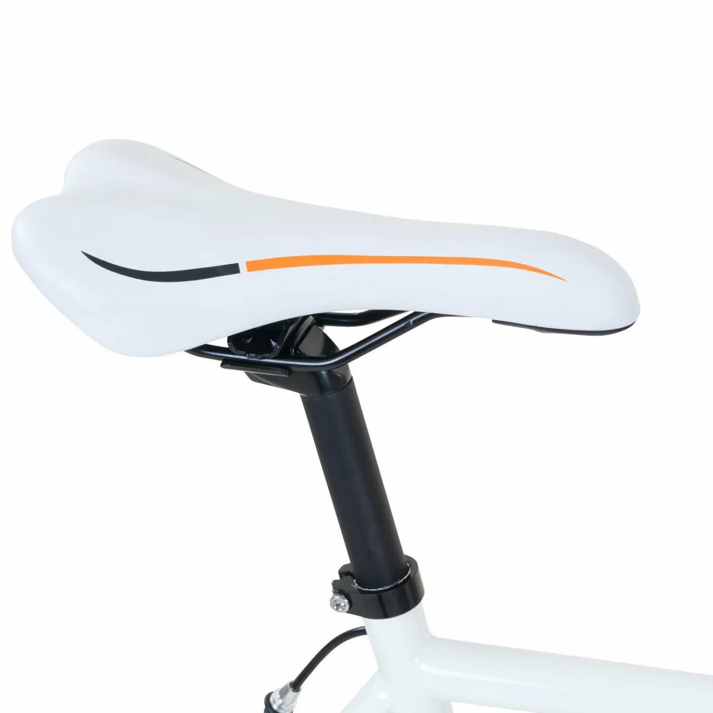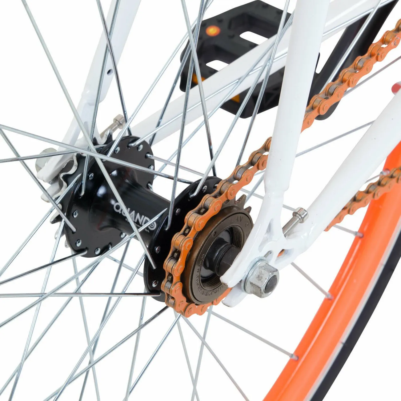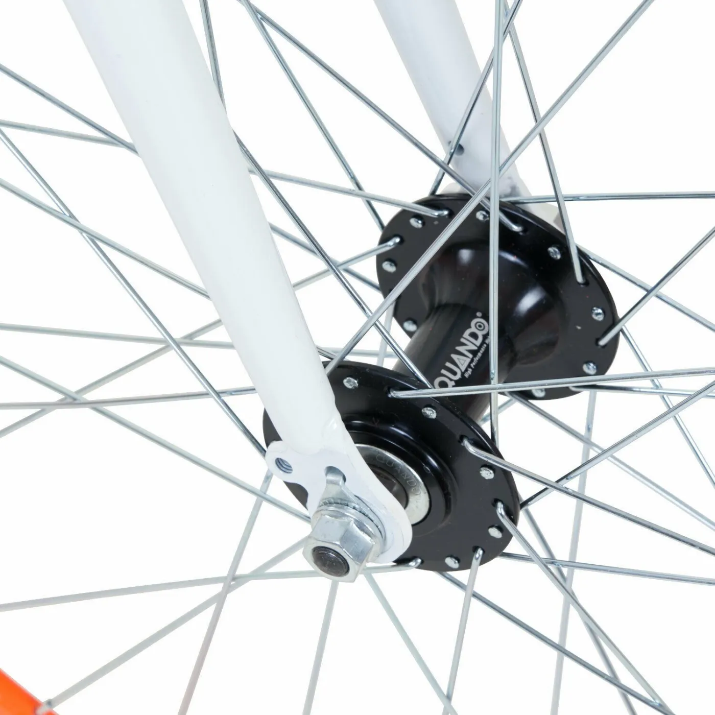 Dzięki cienkiej ramie ze stali o dużej wytrzymałości na rozciąganie oraz przednim i tylnym hamulcom dual pivot z podwójną osią, rower porusza się po mieście jak strzała. Rower jednobiegowy stoi na oponach 700c x 28c, które rozciągają się wokół aluminiowych obręczy dwuściennych w intensywnym, pomarańczowym kolorze, który można znaleźć również na siodełku, mostku i uchwytach.