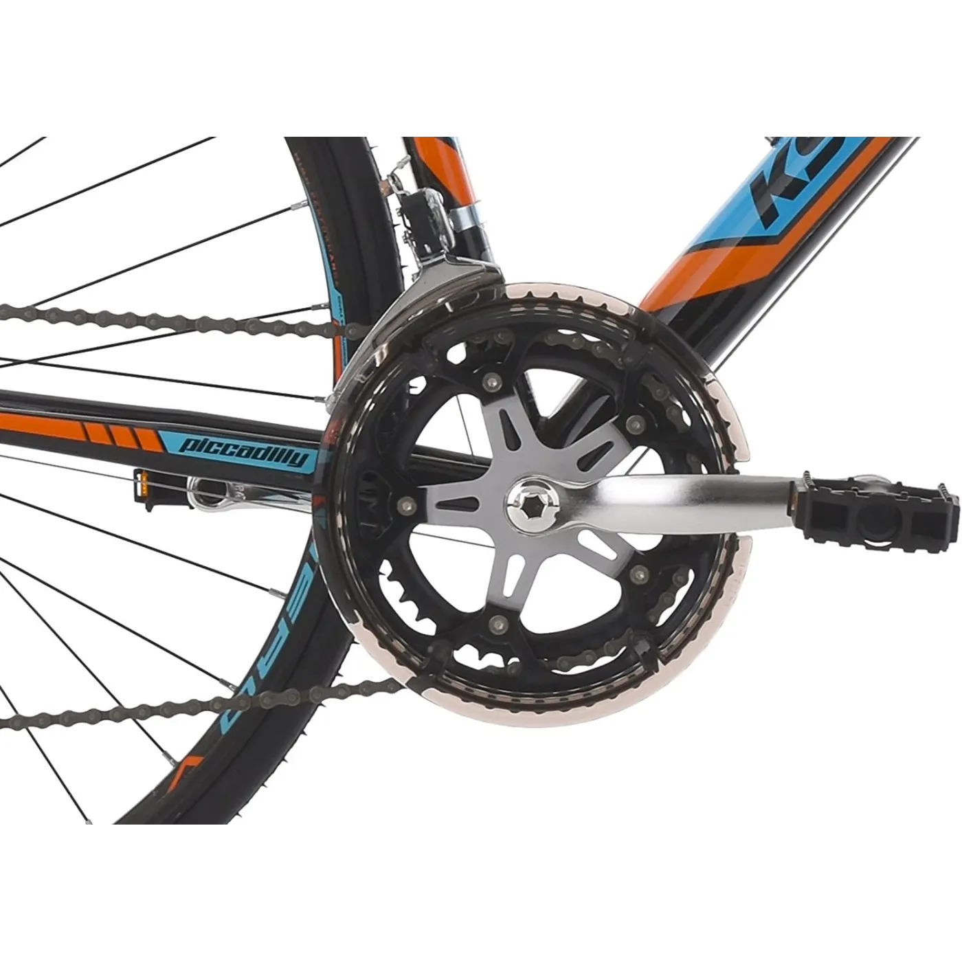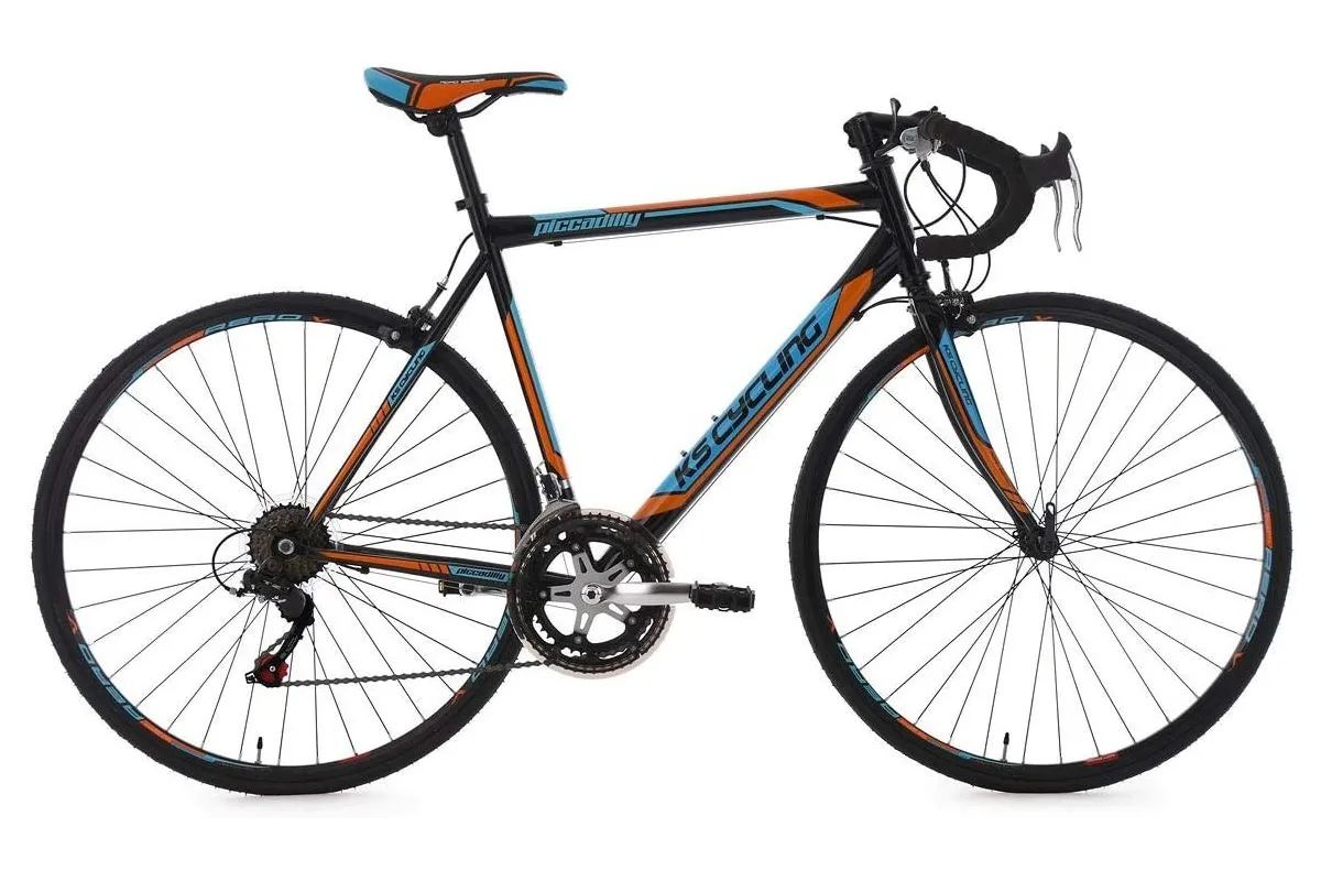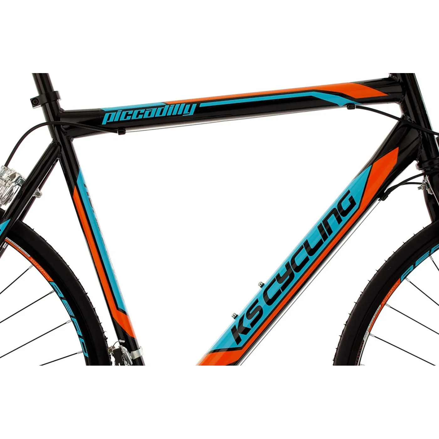 Rower szosowy Piccadilly marki KS Cycling! Czarna rama z detalami w kolorach niebieskim i pomarańczowym zachwyca wyjątkowym sportowym wyglądem i na pewno przyciągnie wzrok. Do całości pasuje wygodne kolorowe siodełko o ergonomicznym kształcie. Solidne stalowe korby łączą tarcze przedniej przerzutki z pedałami platformowymi.