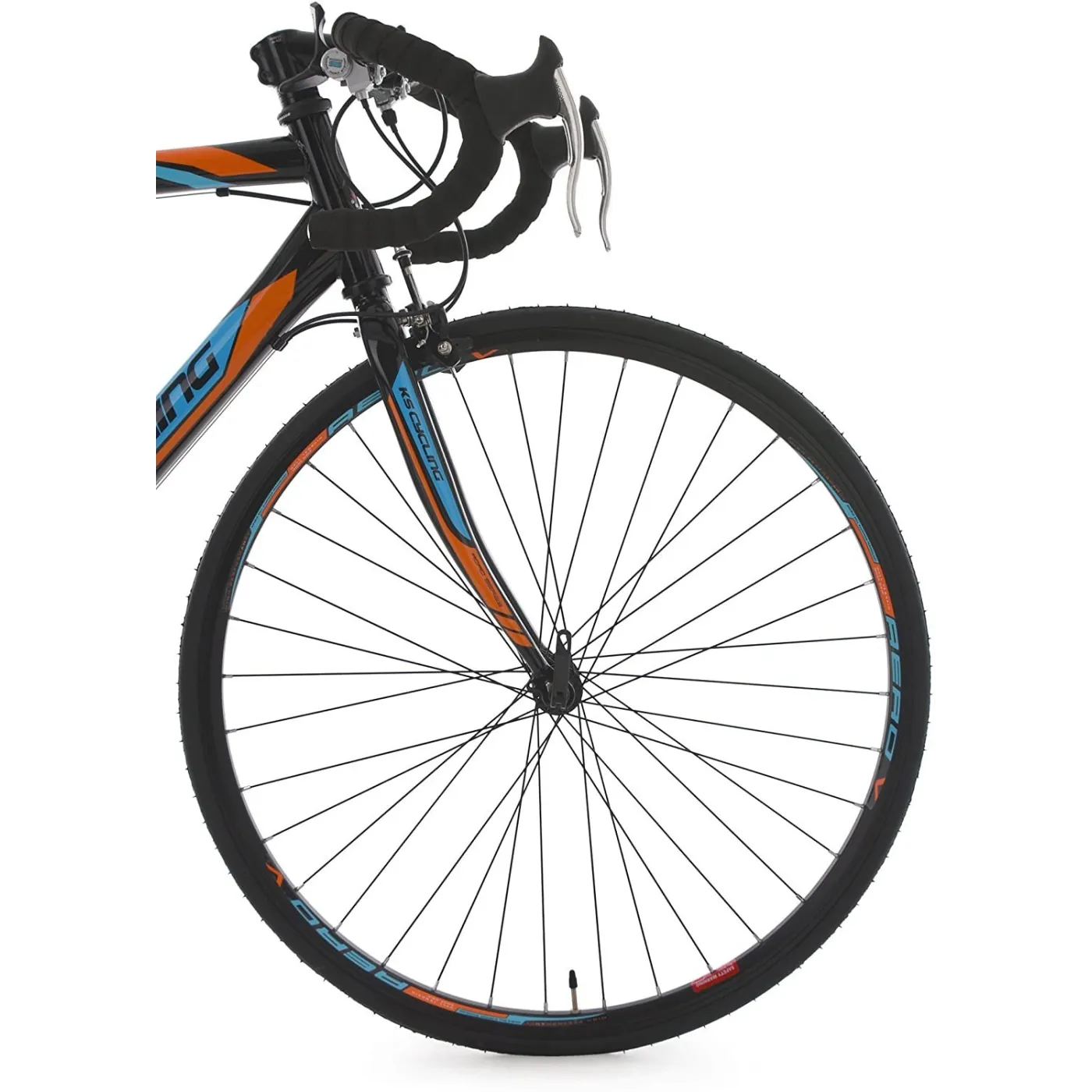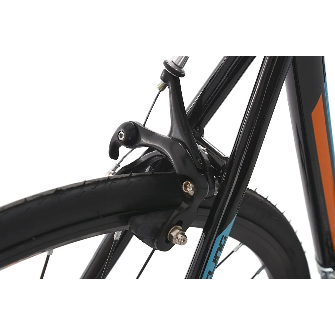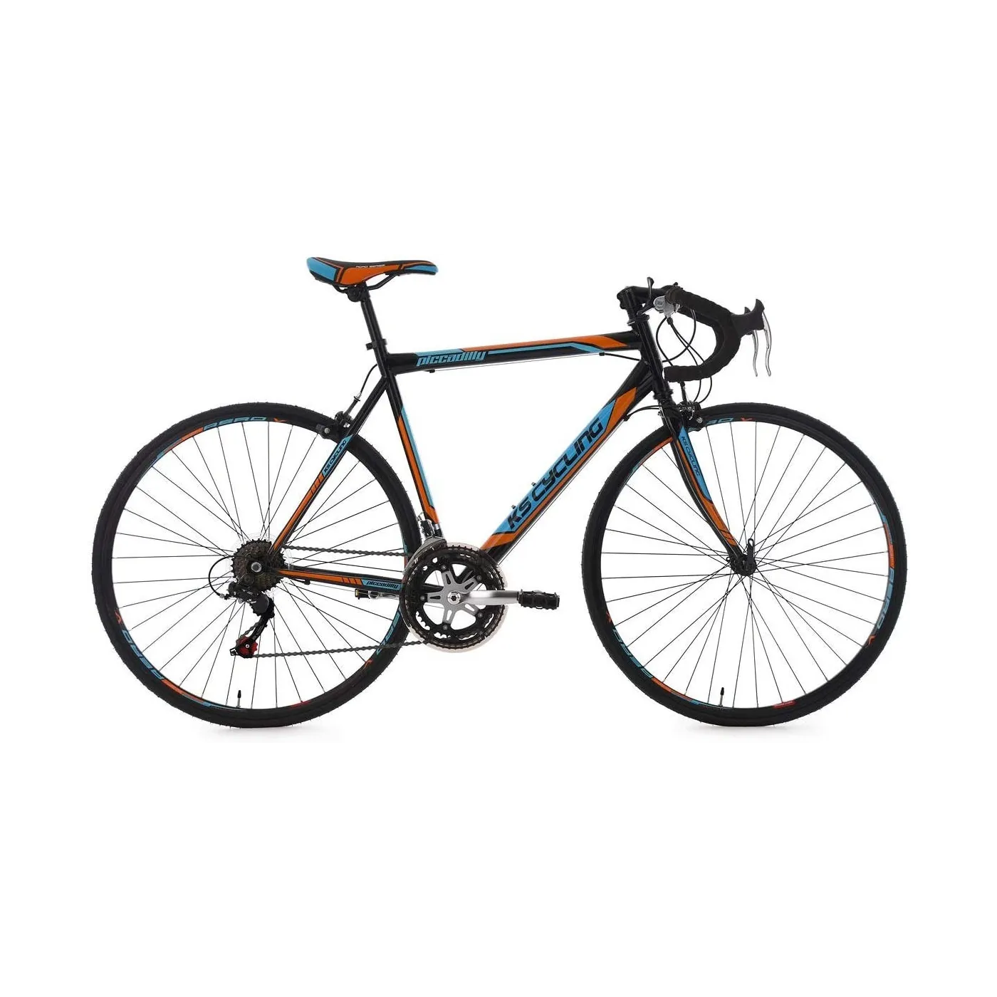 Rower szosowy Piccadilly marki KS Cycling! Czarna rama z detalami w kolorach niebieskim i pomarańczowym zachwyca wyjątkowym sportowym wyglądem i na pewno przyciągnie wzrok. Do całości pasuje wygodne kolorowe siodełko o ergonomicznym kształcie. Solidne stalowe korby łączą tarcze przedniej przerzutki z pedałami platformowymi.