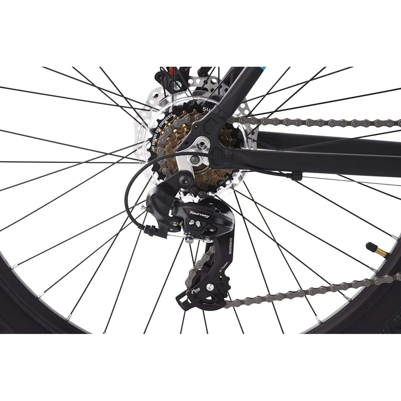 Bezpieczne hamowanie w każdej sytuacji za pomocą hamulców tarczowych, wygodna jazda z amortyzowanym widelcem. Oprócz tego rower jest wyposażony w 21 biegów od Shimano.