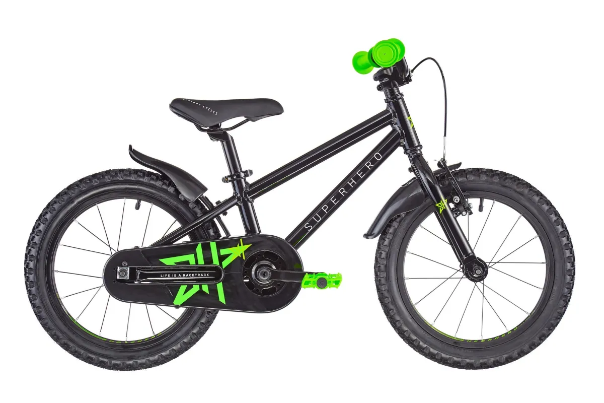 Superhero popisuje się przyczepnymi, profilowanymi oponami, kierownicą Rizer Bar, stylowymi błotnikami motocrossowymi i szybkozłączkami na sztycy - tak jak te duże. Opiera się na płynnie działającym hamulcu V na przednim kole i wypróbowanym tylnym (kontra) na tylnym kole. Napęd w jedną stronę z dużą osłoną łańcucha to wszystko, czego potrzebujesz na tym rowerze. W ten sposób mali rowerzyści zachowują kontrolę, a nogawki ich spodni pozostają czyste.