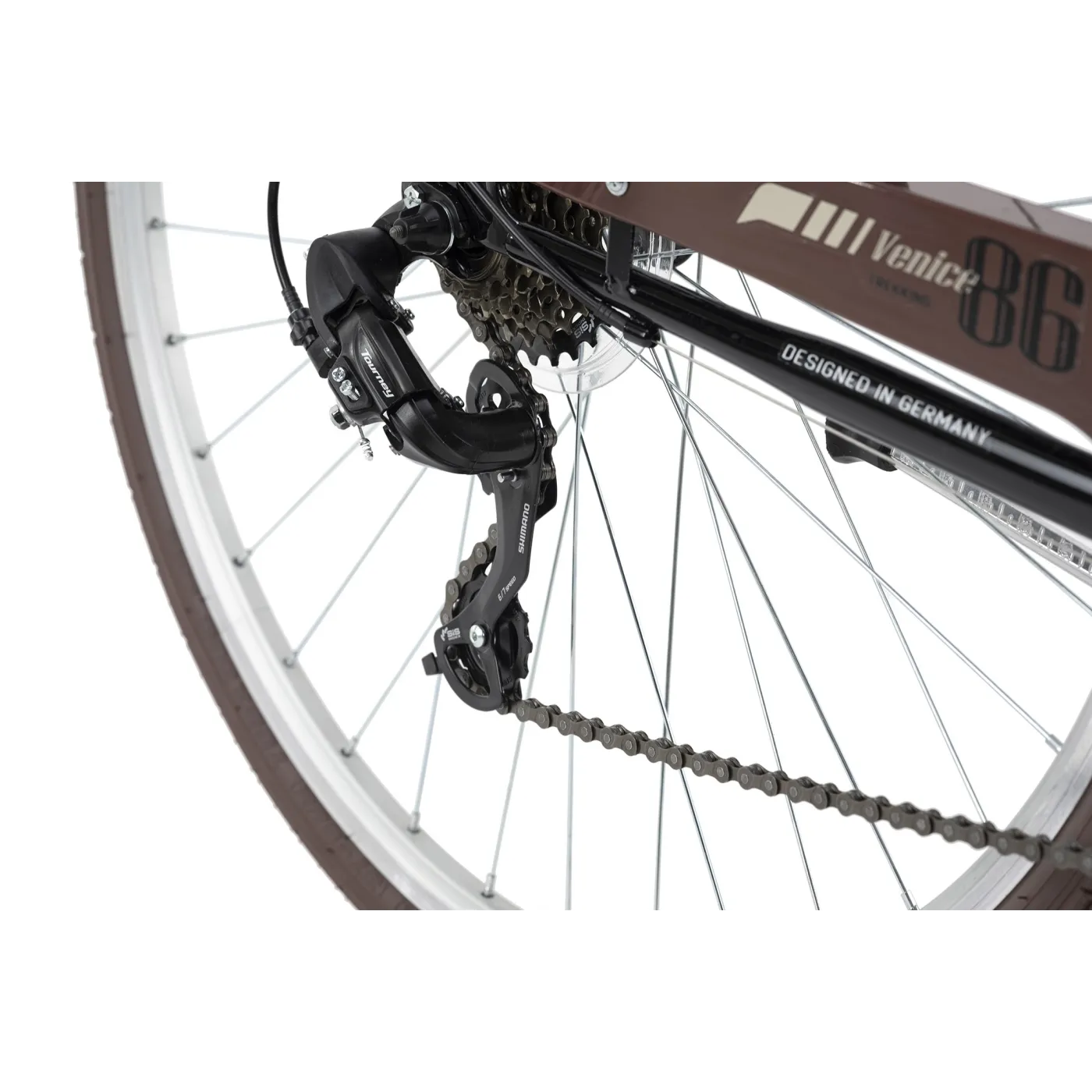 Niezależnie od tego, czy chcesz wygodnie jeździć po mieście, czy planujesz dłuższą wycieczkę: 28-calowy trekkingowy damski rower VENICE firmy KS Cycling jest zawsze z Tobą! Rower ma czarną ramę z eleganckimi detalami. Zawiera również opony, osłonę łańcucha, siodełko i uchwyty, które dopełniają wzór.