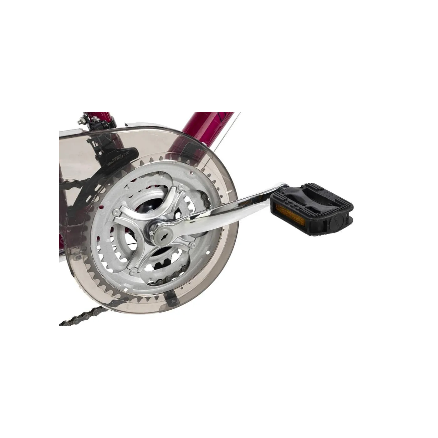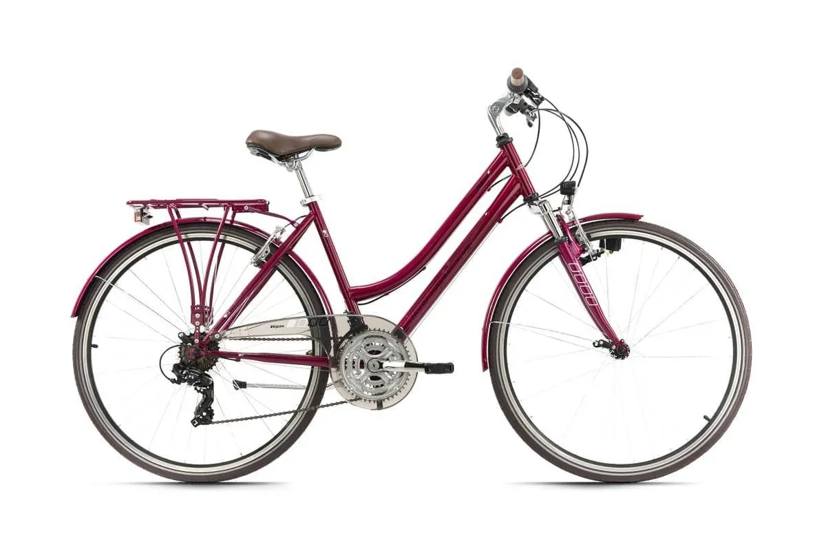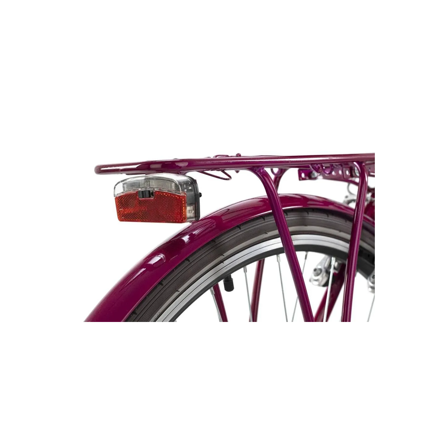 Rama w kolorze czerwono-malinowym wygląda wyjątkowo elegancko. Do tego przezroczysta osłona łańcucha, a także opony, siodełko i kierownica, utrzymane w brązowym kolorze, dopełniają całość.