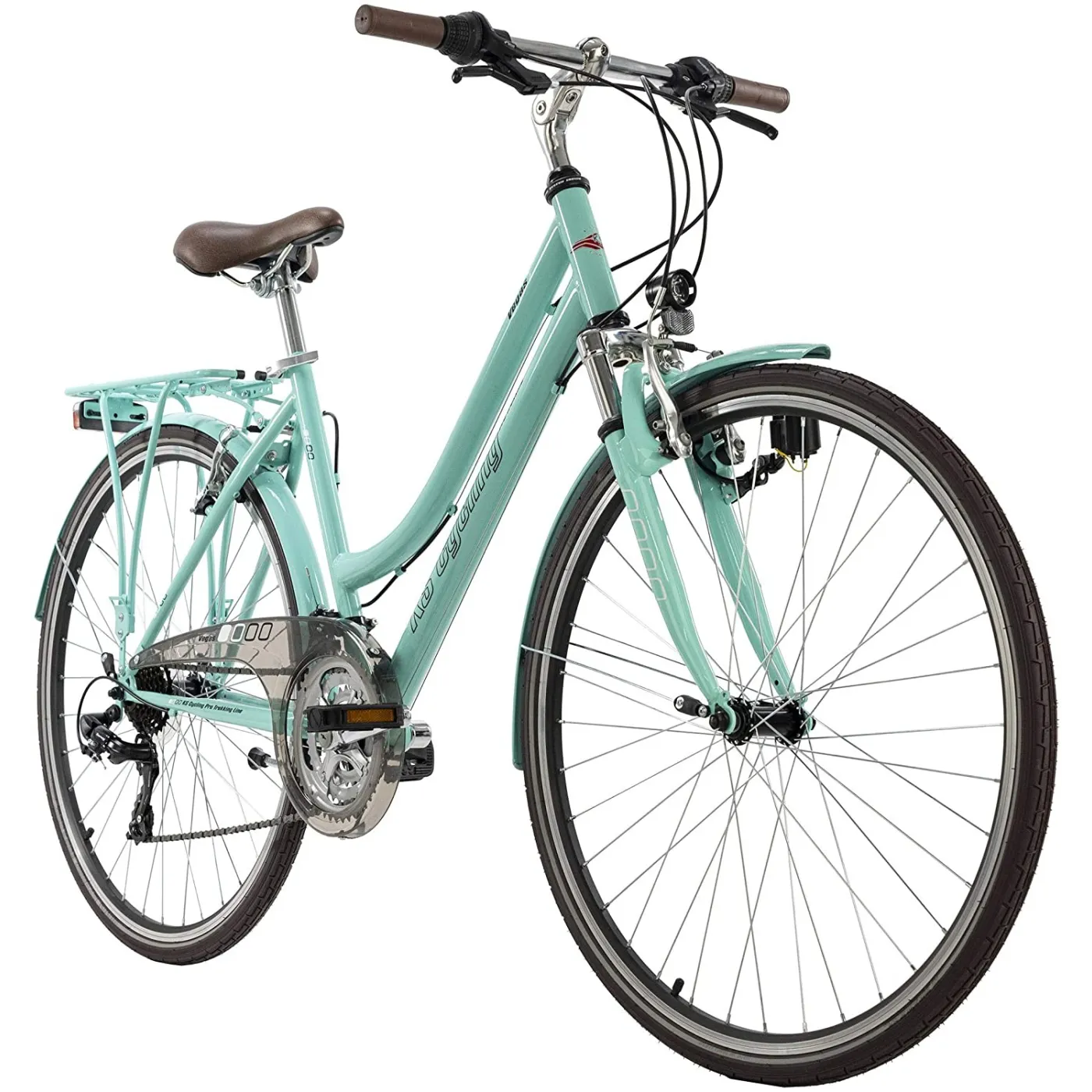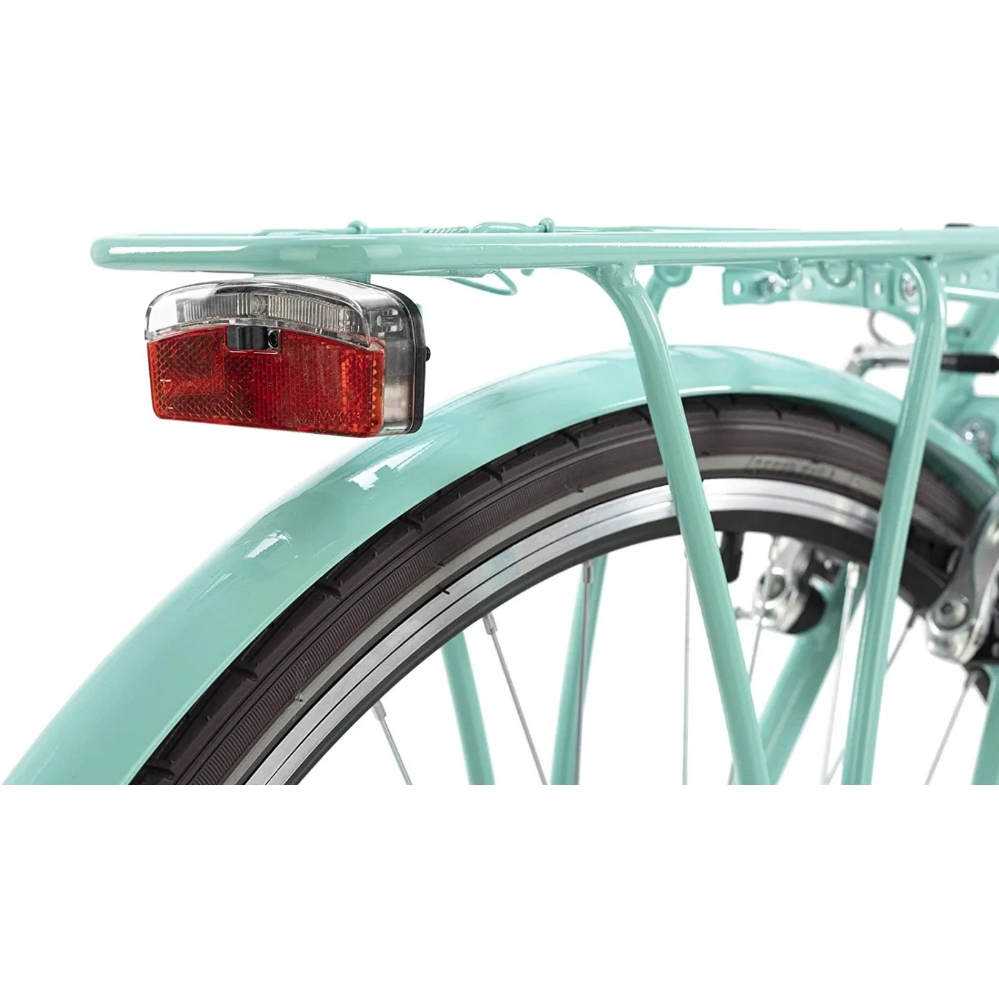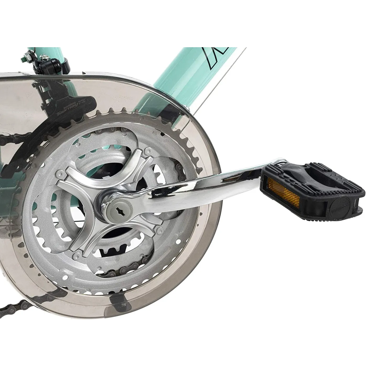 Rama w kolorze turkusowym wygląda wyjątkowo elegancko. Do tego przezroczysta osłona łańcucha, a także opony, siodełko i kierownica, utrzymane w brązowym kolorze, dopełniają całość.