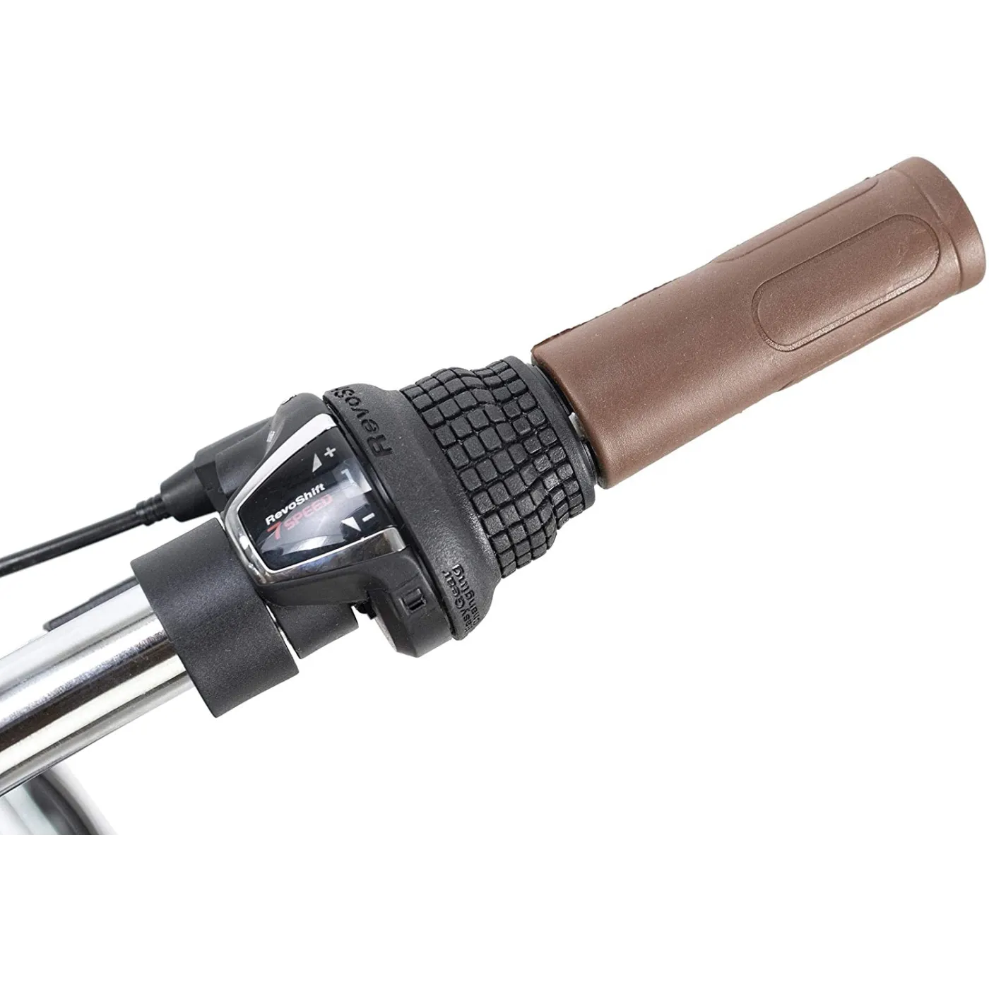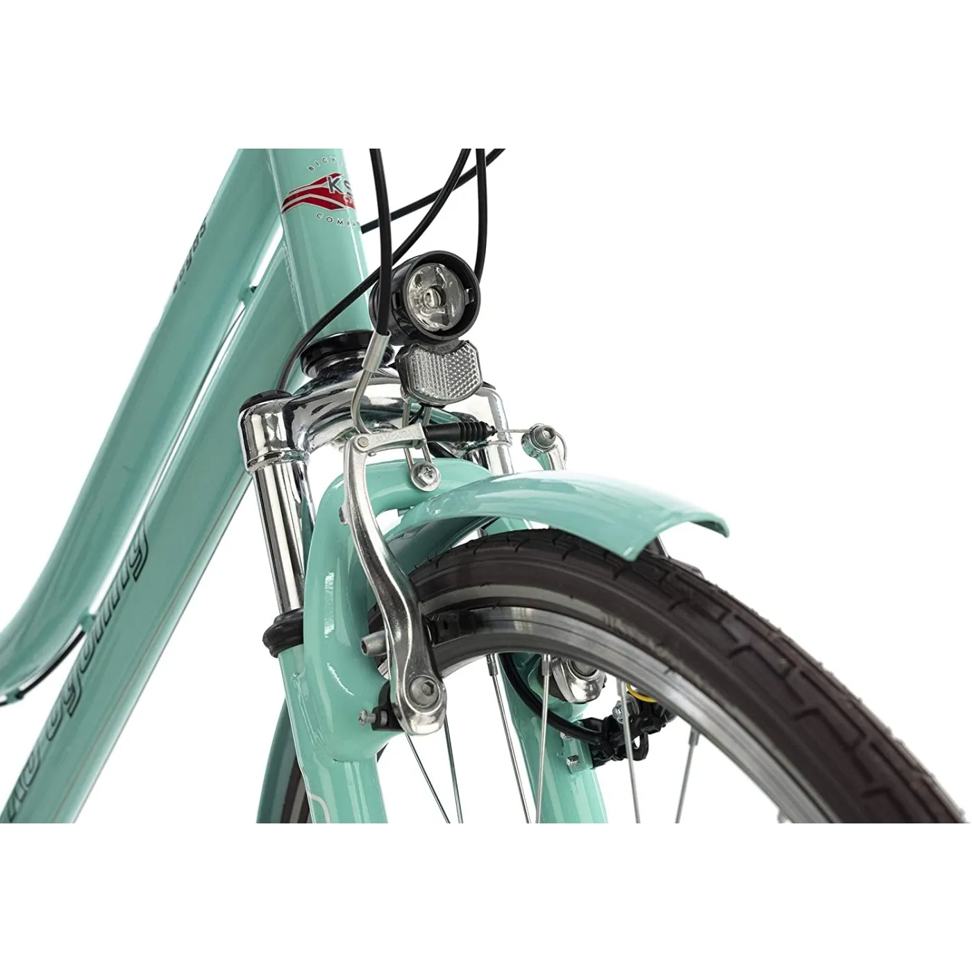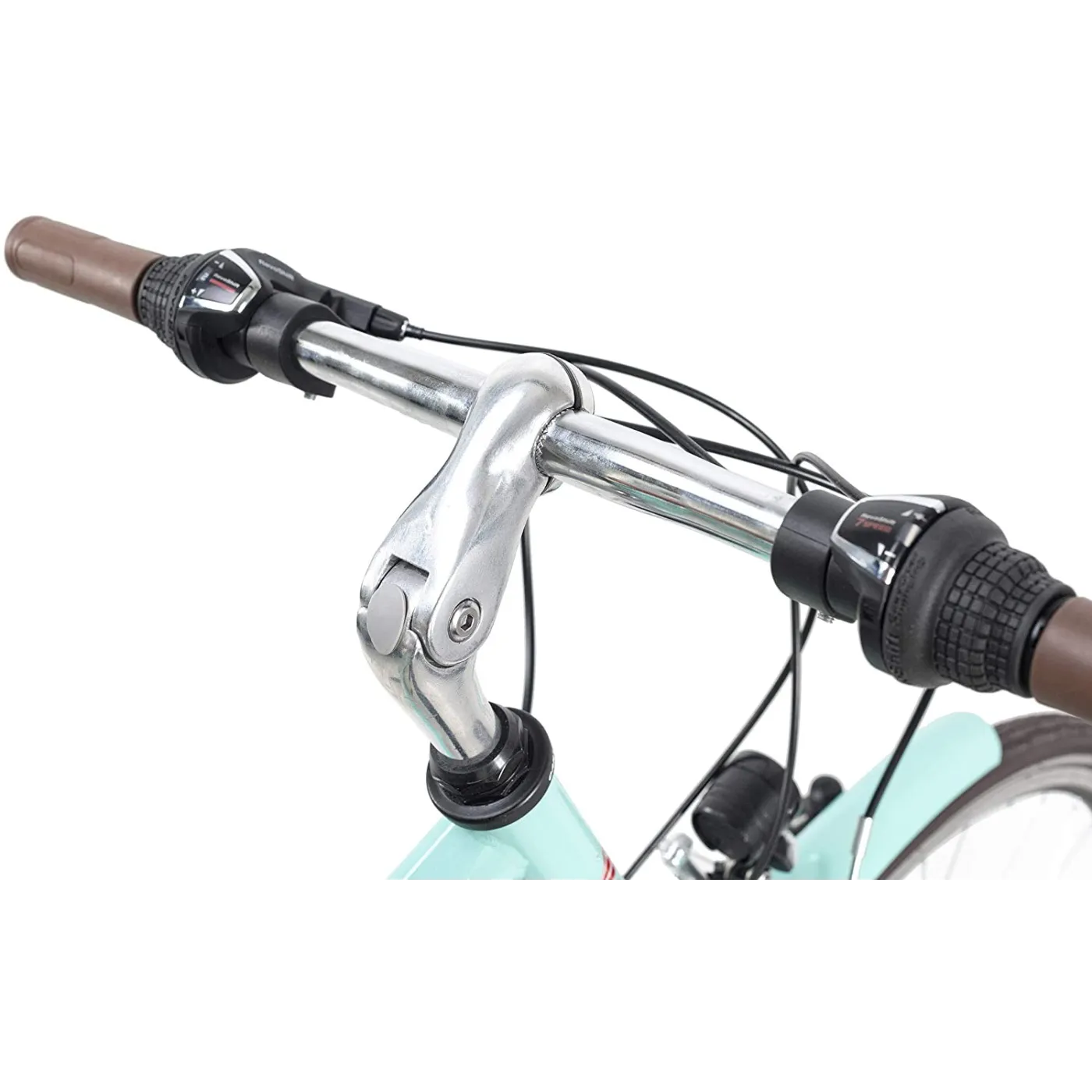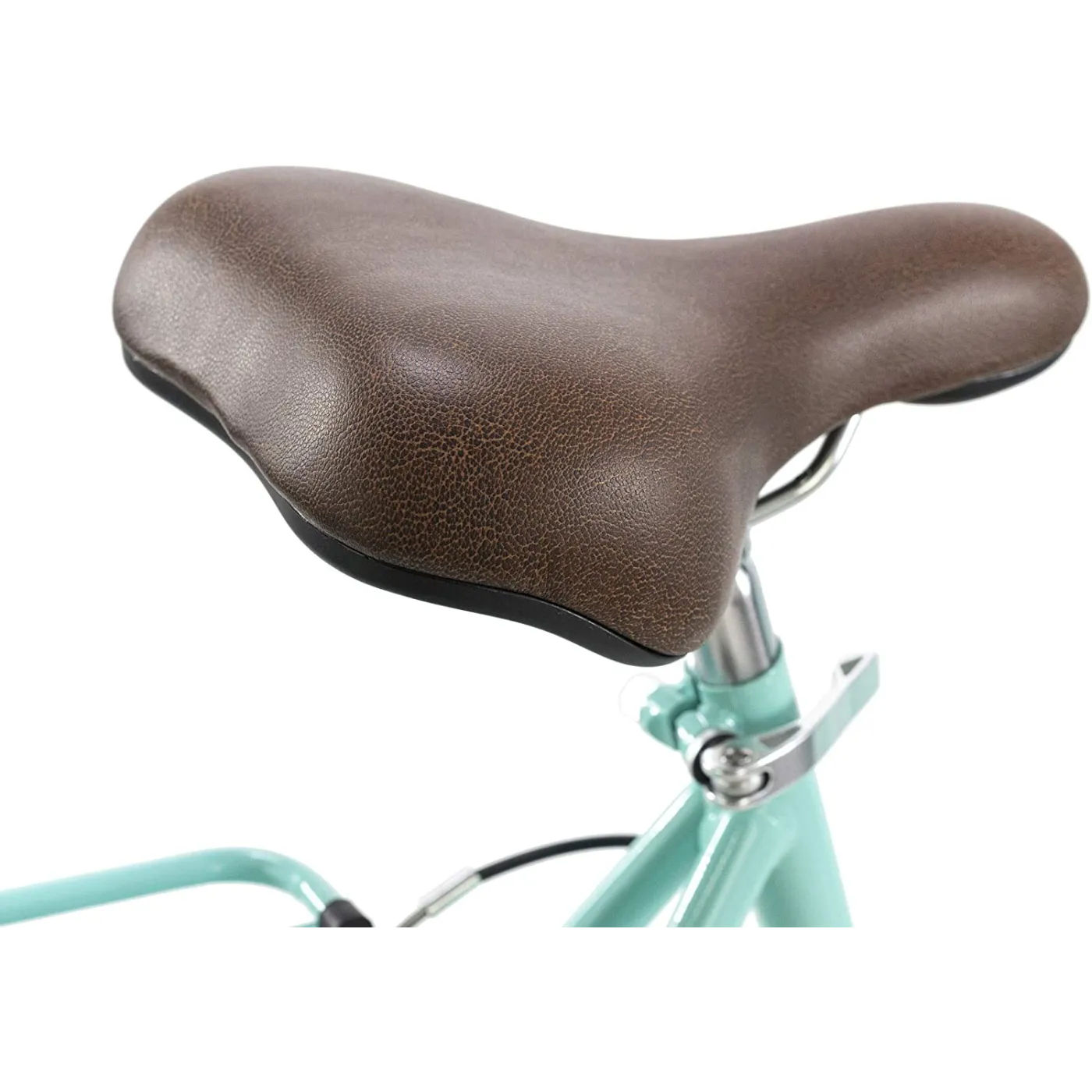 Rama w kolorze turkusowym wygląda wyjątkowo elegancko. Do tego przezroczysta osłona łańcucha, a także opony, siodełko i kierownica, utrzymane w brązowym kolorze, dopełniają całość.