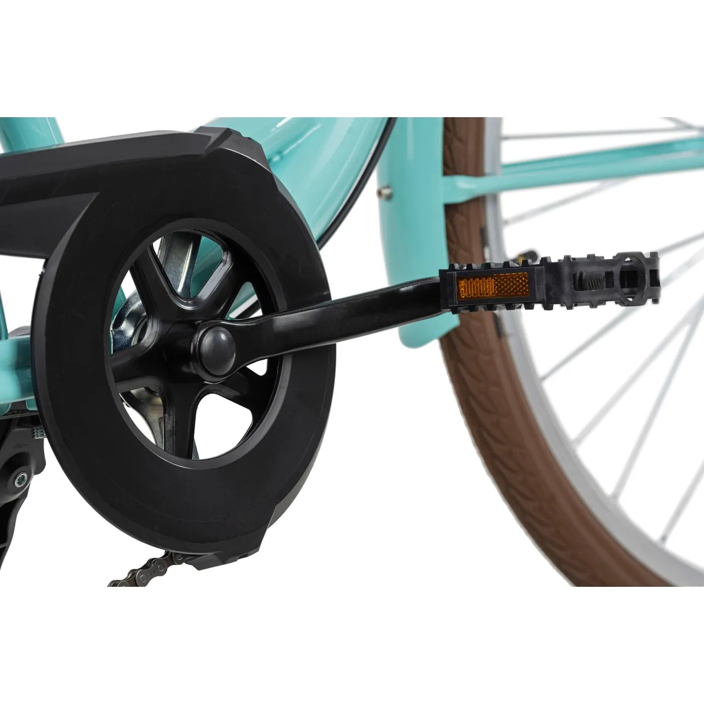 28-calowy damski rower miejski City Six to klasyczny rower do miasta. Jest skierowany do wszystkich, którzy szukają niezawodnego, nieskomplikowanego i łatwego w utrzymaniu i roweru miejskiego. Rower w klasycznym kolorze, brązowe opony, siodełko i chwyty kierownicy nadają mu elegancki wygląd w retro stylu.