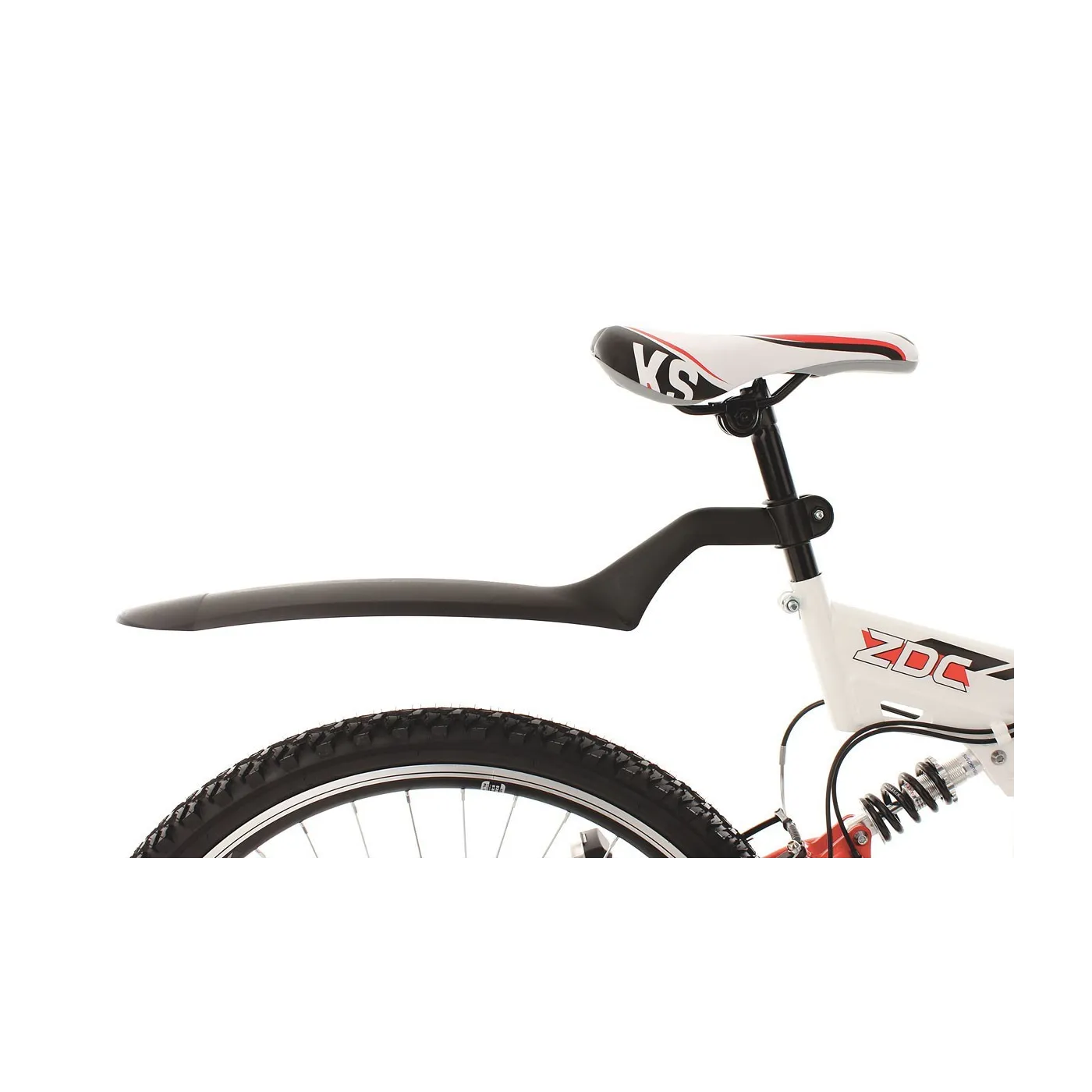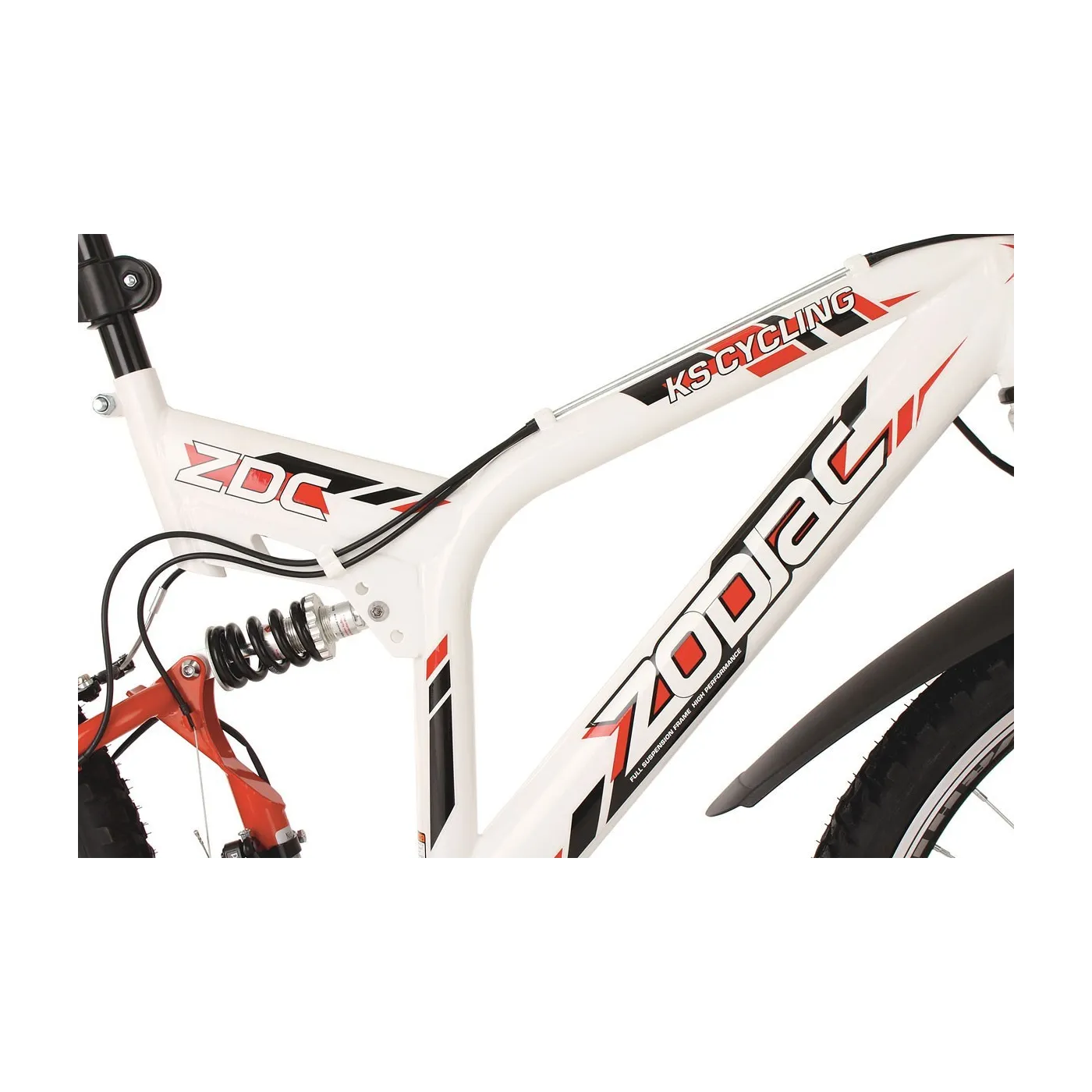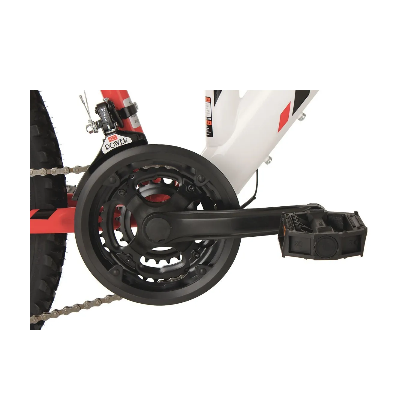 26-calowy rower górski z pełnym zawieszeniem w kolorze białym z czerwonymi detalami.