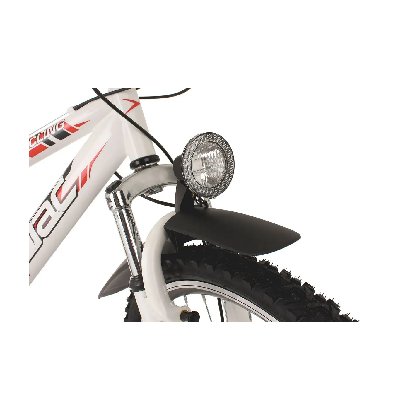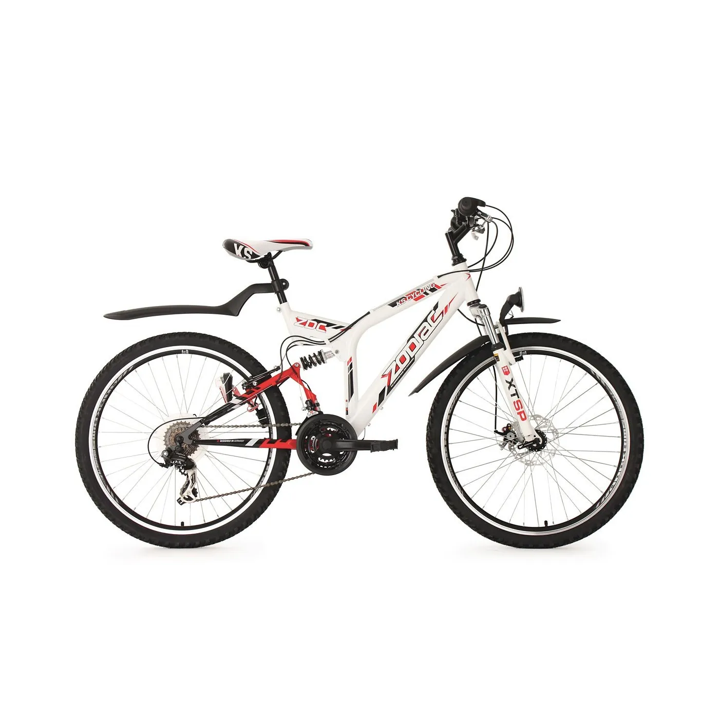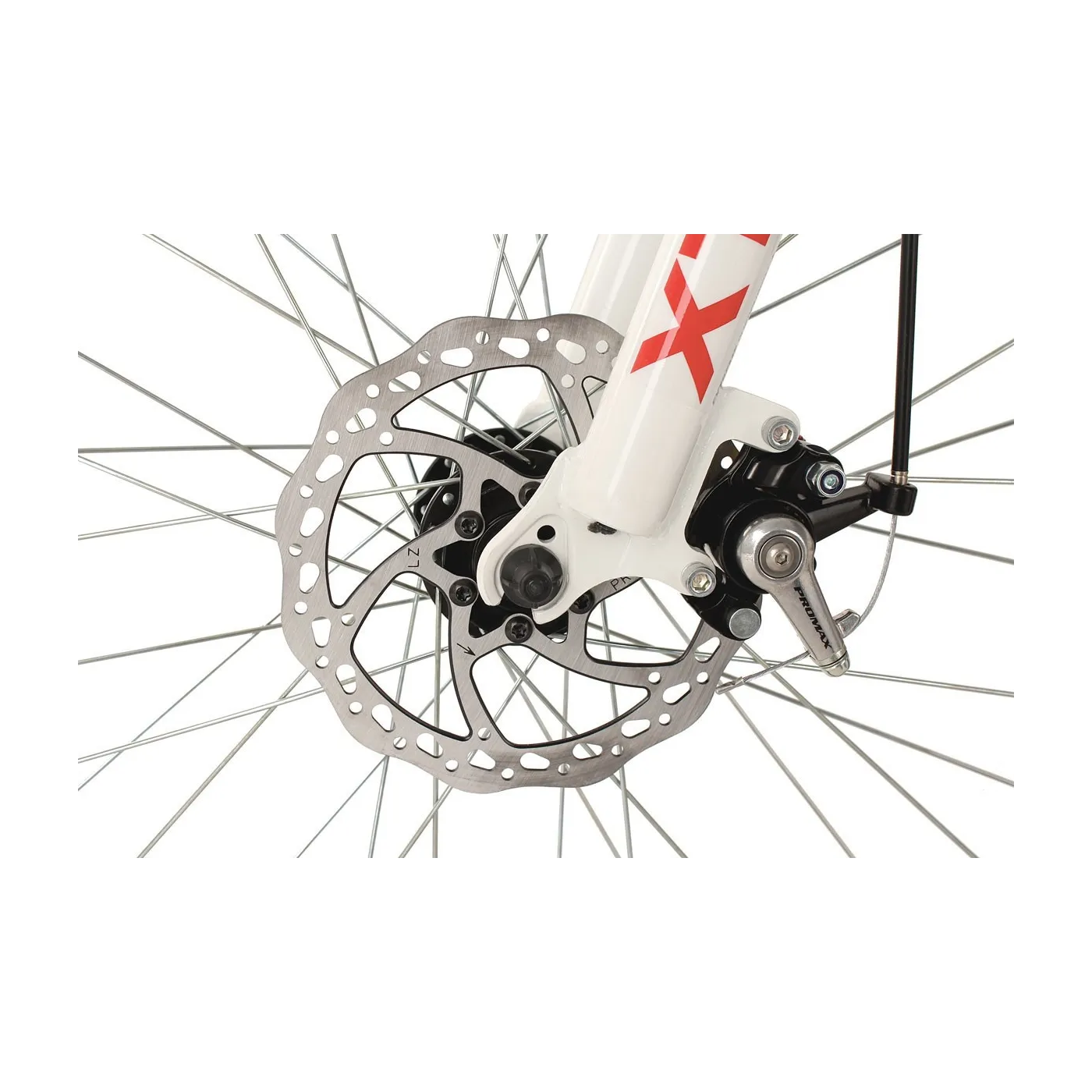 26-calowy rower górski z pełnym zawieszeniem w kolorze białym z czerwonymi detalami.