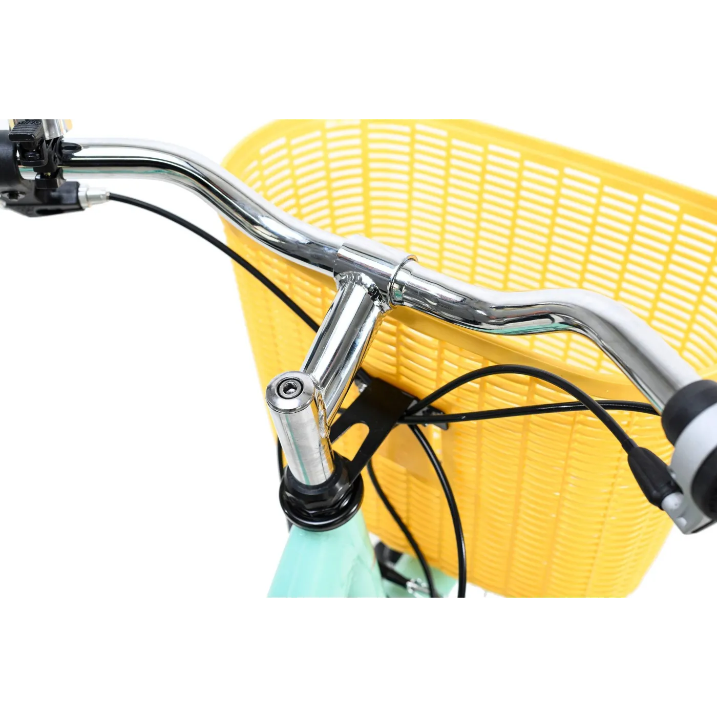 Rower wyposażony jest w niezbędne akcesoria, takie jak bagażnik, błotniki, osłona łańcucha oraz oświetlenie, które pozwoli na bezpieczną jazdę nawet po zmroku. Żółty kosz znajdujący się przy kierownicy jest nie tylko stylowym dodatkiem ale jest również bardzo praktyczny do przechowywania np. zakupów lub torebki. Pełny pakiet akcesoriów sprawia, że jest to idealny partner na codzienne wycieczki.