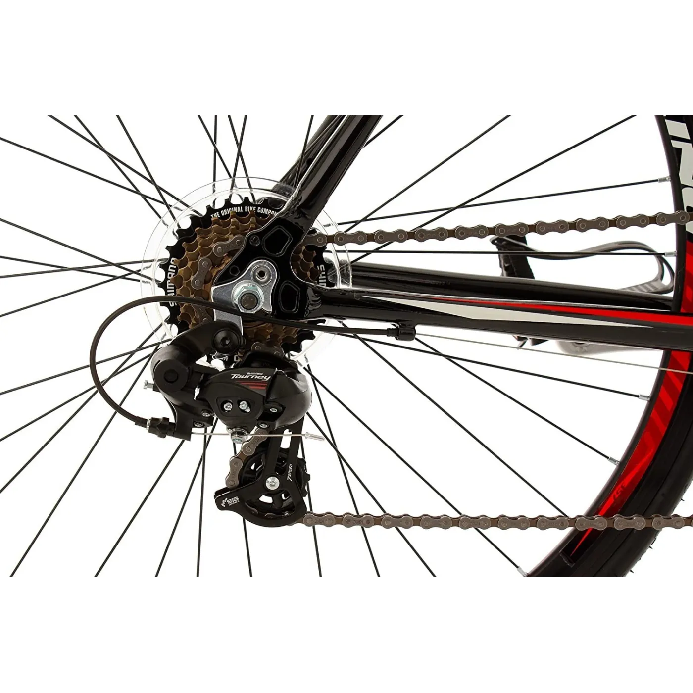 Rower posiada platformowe pedały z możliwością zapięcia butów za pomocą pasków, dla lepszej przyczepności i kontroli.Dzięki aluminiowej ramie i dodatkom rower jest lekki i zwinny. 14 biegowa przerzutka od Shimano, którą możesz wygodnie zmieniać za pomocą manetek SHIMANO ułatni podjazd w trudniejszym terenie, a antypoślizgowa owijka kierownicy zapewnia optymalny chwyt. Wyścigowe hamulce zapewniają bezpieczne hamowanie w każdej sytuacji.