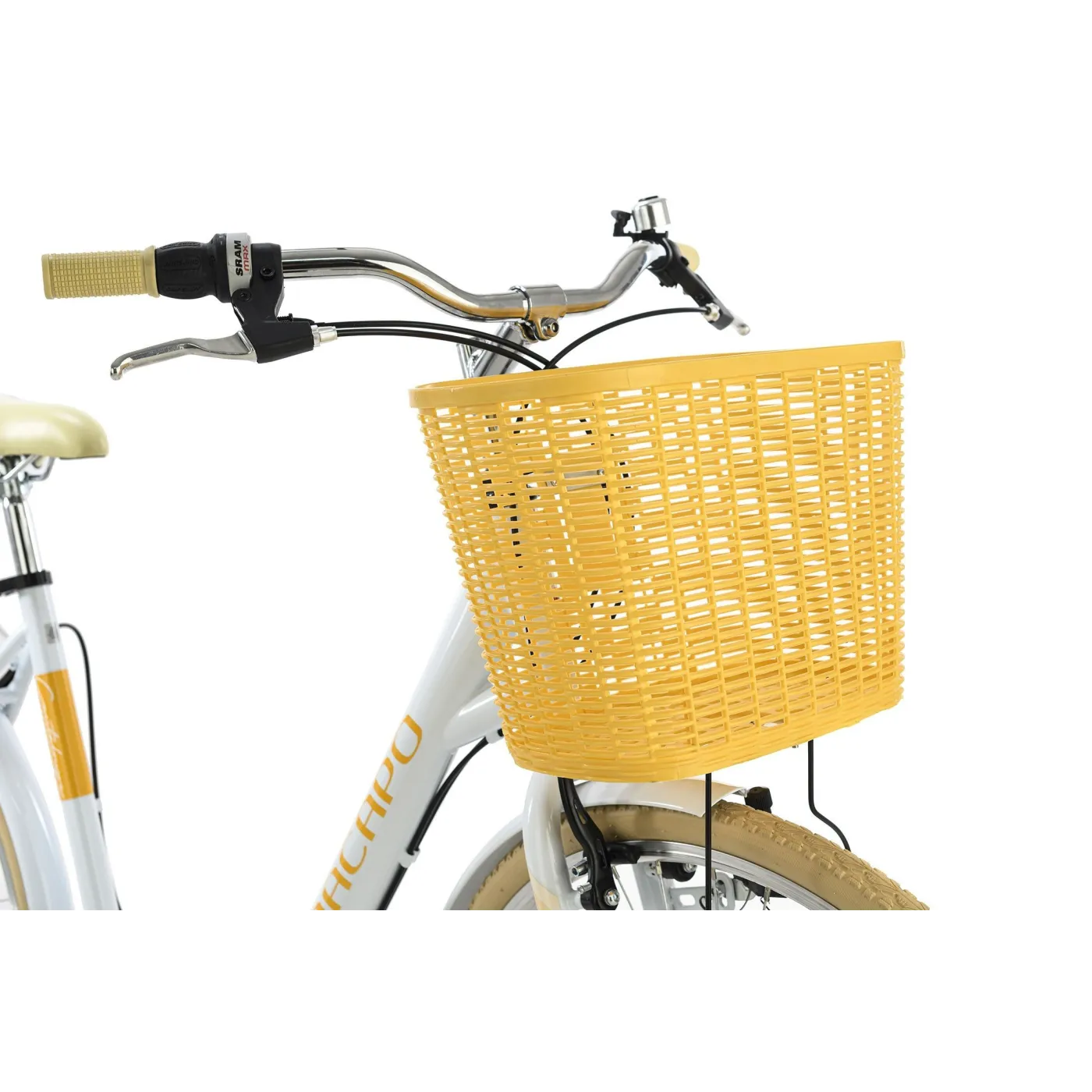 Rower wyposażony jest w niezbędne akcesoria, takie jak bagażnik, błotniki, osłona łańcucha oraz oświetlenie, które pozwoli na bezpieczną jazdę nawet po zmroku. Żółty kosz znajdujący się przy kierownicy jest nie tylko stylowym dodatkiem ale jest również bardzo praktyczny do przechowywania np. zakupów lub torebki. Pełny pakiet akcesoriów sprawia, że jest to idealny partner na codzienne wycieczki.