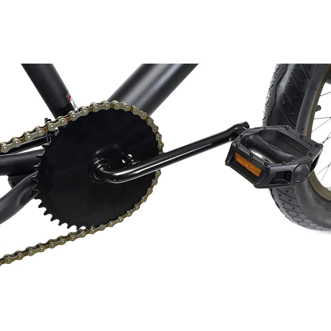 20-calowy BMX FATT firmy KS Cycling zaprojektowany w całości w kolorze czarnym, z matową ramą w połączeniu z brązowymi, połyskującymi obręczami. Nie mogło być lepiej! Do tego cztery stalowe pegi do trików i najważniejsze - szerokie opony FATT. To one sprawiają, że rower przyciąga wzrok i zdecydowanie wyróżnia się spośród reszty.Wyjątkowy rower zachwyca solidnością i wykonaniem.