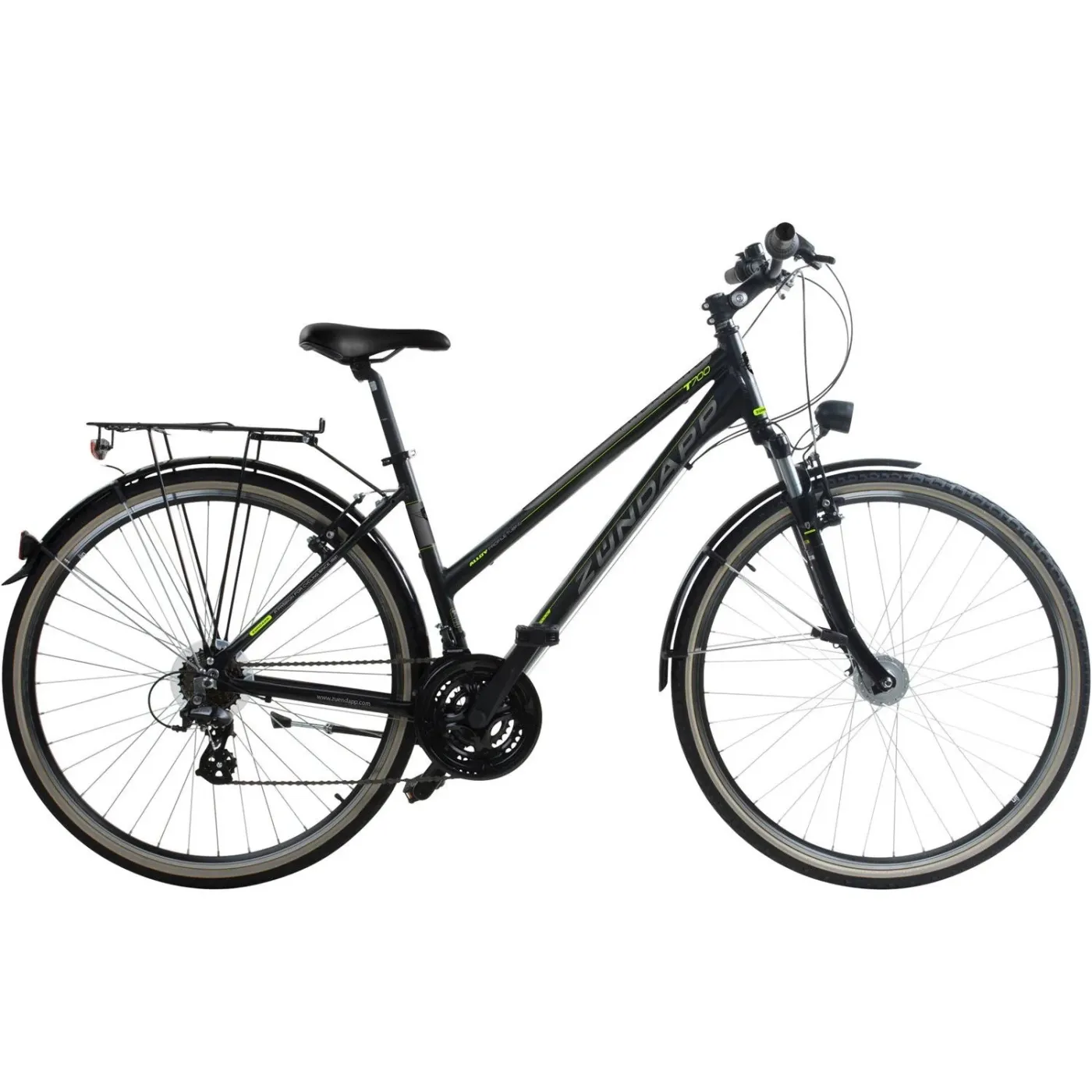 Rower jeździ na łatwych w prowadzeniu oponach o wymiarach 700c x 40c, których profil pozwala na dużą prędkość na asfalcie i nadal zapewnia wystarczającą przyczepność na zakrętach. Zündapp T700 ma szeroką gamę funkcji, dzięki czemu możesz natychmiast rozpocząć jazdę i nie musisz kupować dodatkowych akcesoriów. Oprócz osłon łańcucha, błotników, stopki bocznej i praktycznego bagażnika, szczególnie ważne jest oświetlenie, którego rower potrzebuje zgodnie z StVZO. Lampy są zasilane energią przez dynamo w piaście na przednim kole. Rower trekkingowy polecamy rowerzystom o wzroście od 160 do 180 cm.