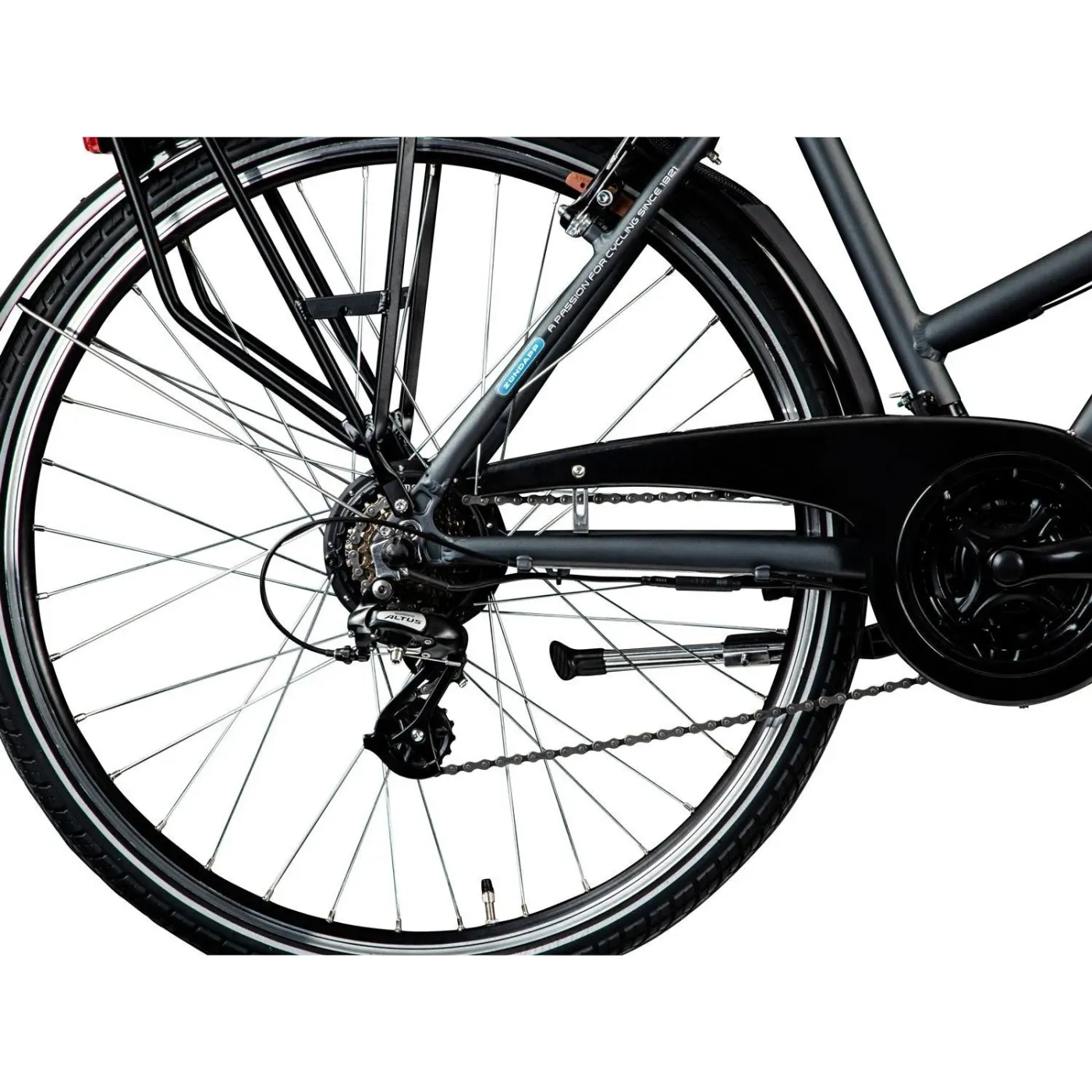 Napęd łańcuchowy składa się ze sprawdzonych komponentów Shimano i zapewnia 21 biegów, dzięki czemu można robić dobre postępy nawet bez napędu elektrycznego. Zmiana biegów odbywa się za pomocą manetki obrotowej RevoShift. Mocne hamulce typu V-brake firmy Promax zapewniają optymalną kontrolę i bezpieczeństwo roweru.