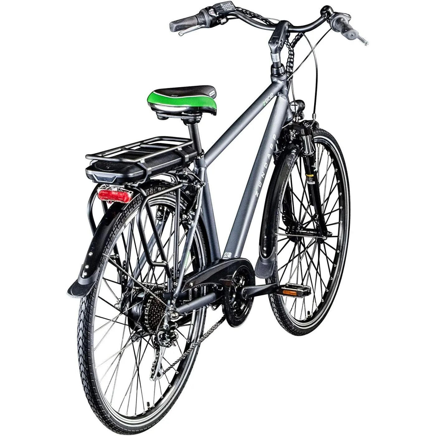 Podstawową konstrukcją e-roweru jest lekka rama diamentowa wykonana z aluminium, która jest połączona z widelcem amortyzowanym o skoku zawieszenia 63 mm. W połączeniu z kierownicą miejską z tylną korbą i mostkiem z regulacją kąta, rower zapewnia wygodną pozycję siedzącą, która pozwala jeździć przez długi czas bez objawów zmęczenia. Możesz też długo wytrzymać na wygodnym siodle.
