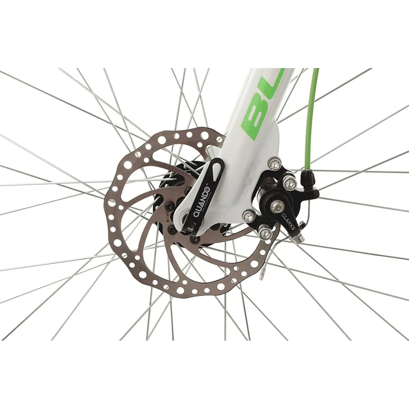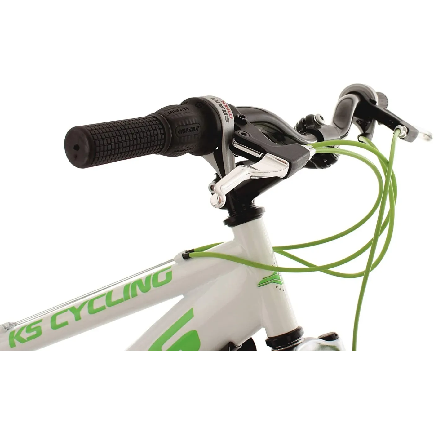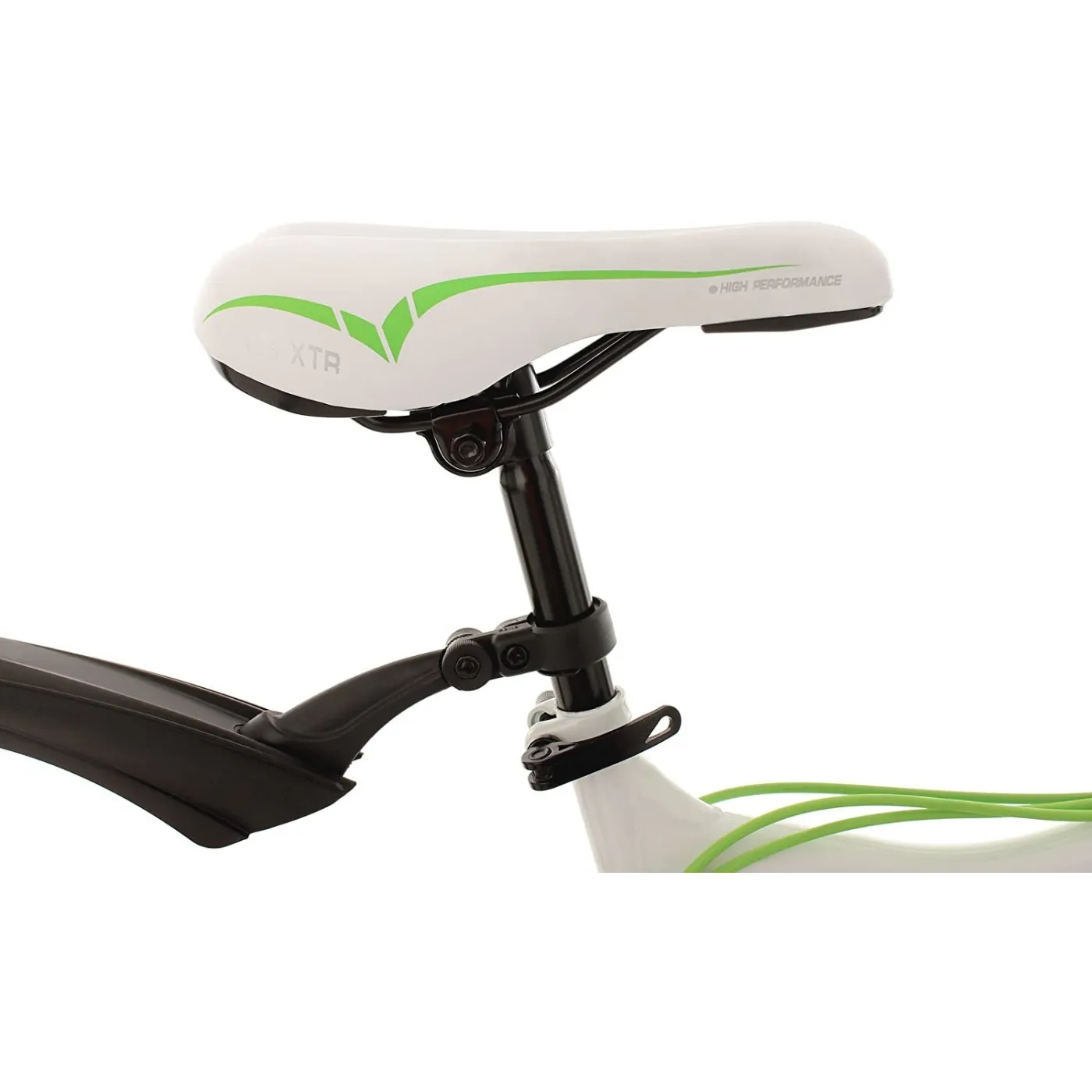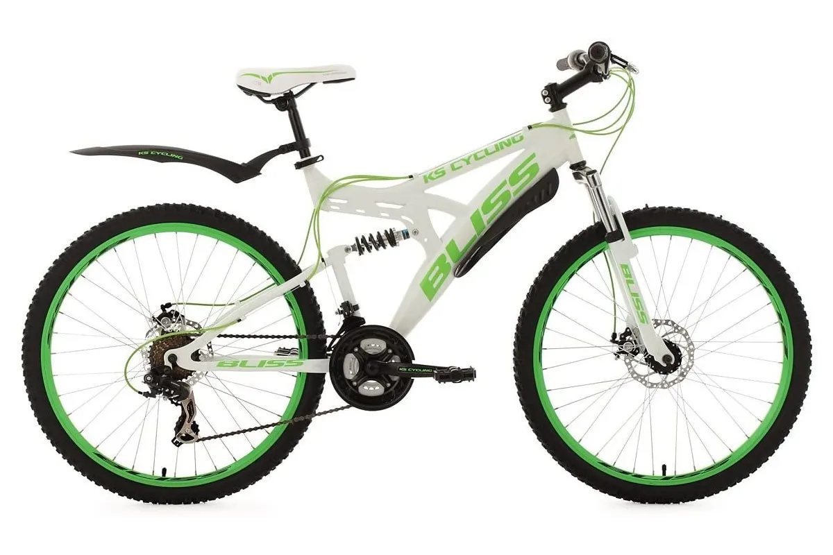 26-calowy rower górski z pełnym zawieszeniem w kolorze białym z jasnozielonymi detalami, które sprawiają, że rower wyróżnia się spośród innych.