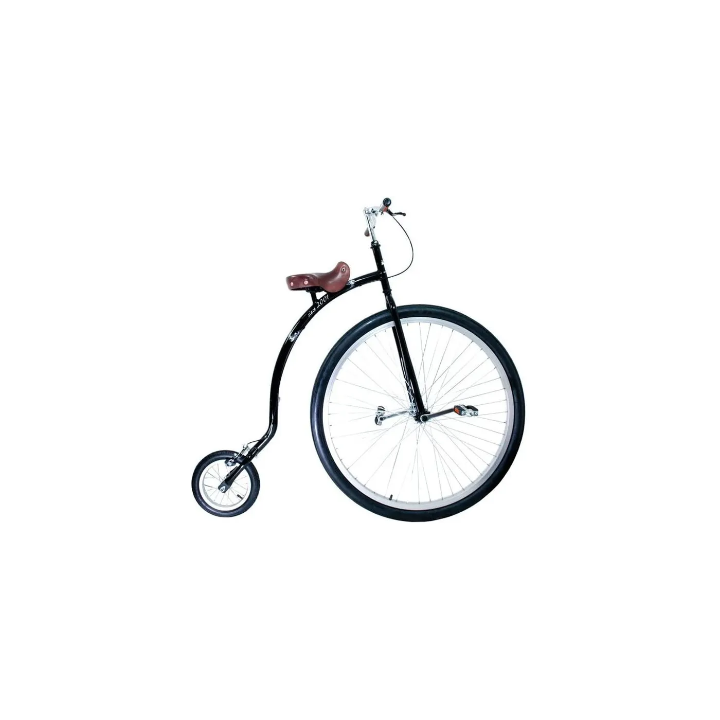 Niepowtarzalny wygląd starodawnego bicykla - dwukołowy rower bez przekładni łańcuchowej, z wielkim przednim kołem i małym tylnym.