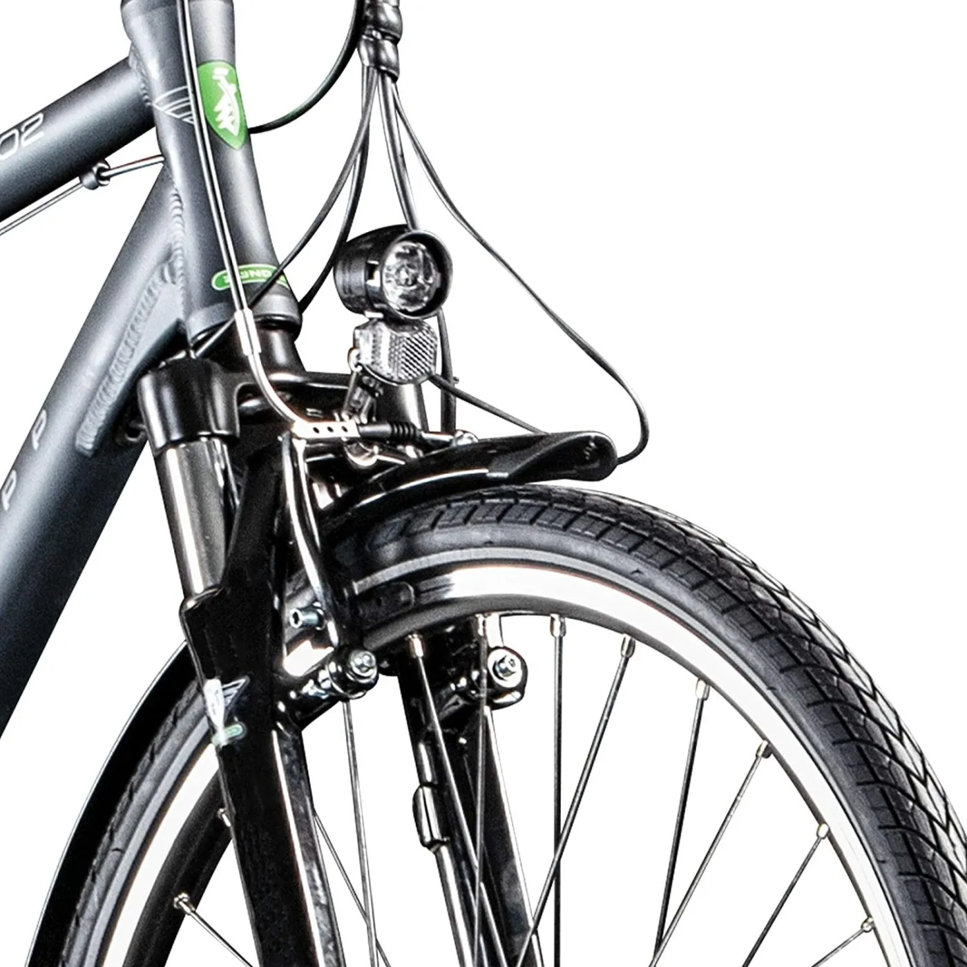 Podstawową konstrukcją e-roweru jest lekka rama diamentowa wykonana z aluminium, która jest połączona z widelcem amortyzowanym o skoku zawieszenia 63 mm. W połączeniu z kierownicą miejską z tylną korbą i mostkiem z regulacją kąta, rower zapewnia wygodną pozycję siedzącą, która pozwala jeździć przez długi czas bez objawów zmęczenia. Możesz też długo wytrzymać na wygodnym siodle.