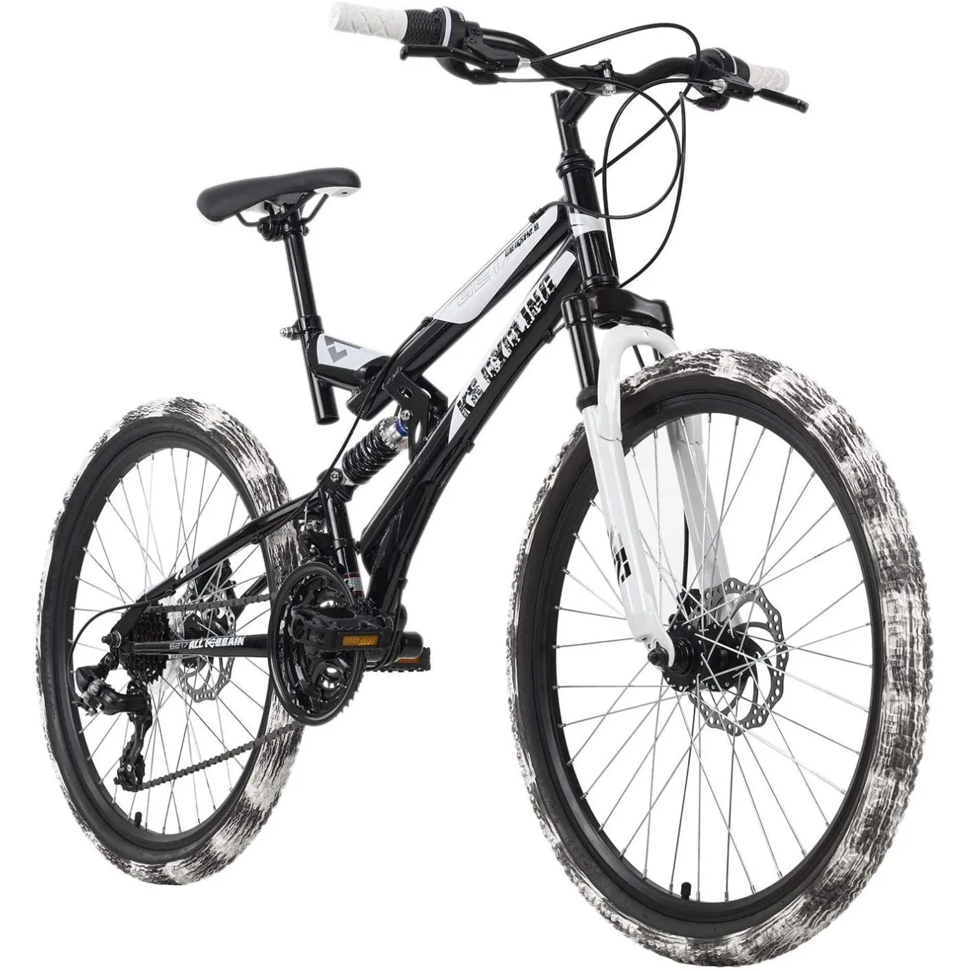 Idealny w drodze do szkoły lub na weekendowy wypad do lasu. 24-calowy młodzieżowy rower górski CRUSHER firmy KS Cycling jest idealny do rozpoczęcia kolarstwa górskiego. Czarna rama z białymi detalami jest stylizowana, dopasowana do opon i przyciąga uwagę wszystkich. Każda opona jest wyjątkowa, a wyposażenie techniczne roweru dziecięcego nie pozostawia nic do życzenia. Rower górski z pełnym zawieszeniem jest wyposażony w hamulce tarczowe, a 21-biegowe przełożenia z obrotowymi manetkami uzupełniają pakiet.