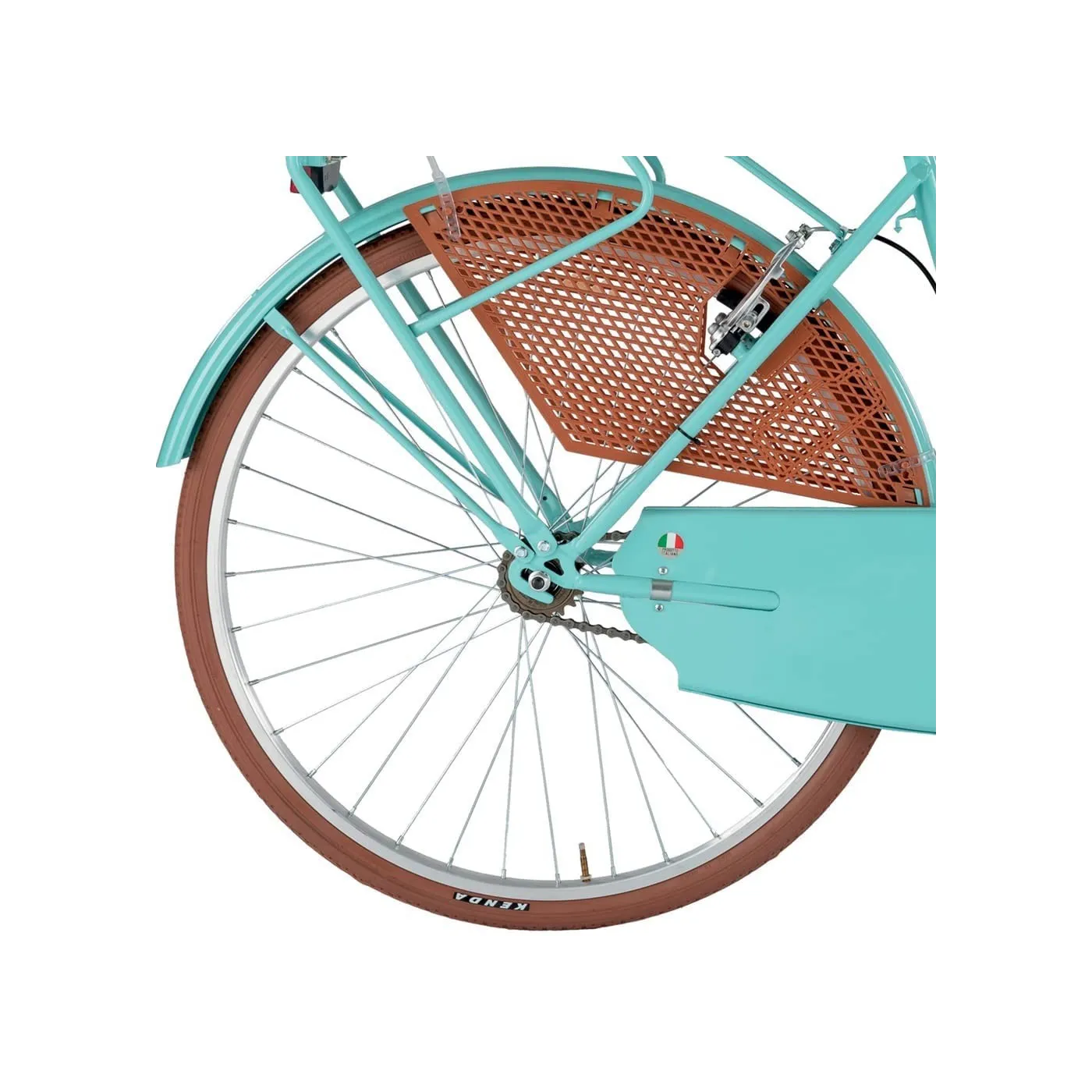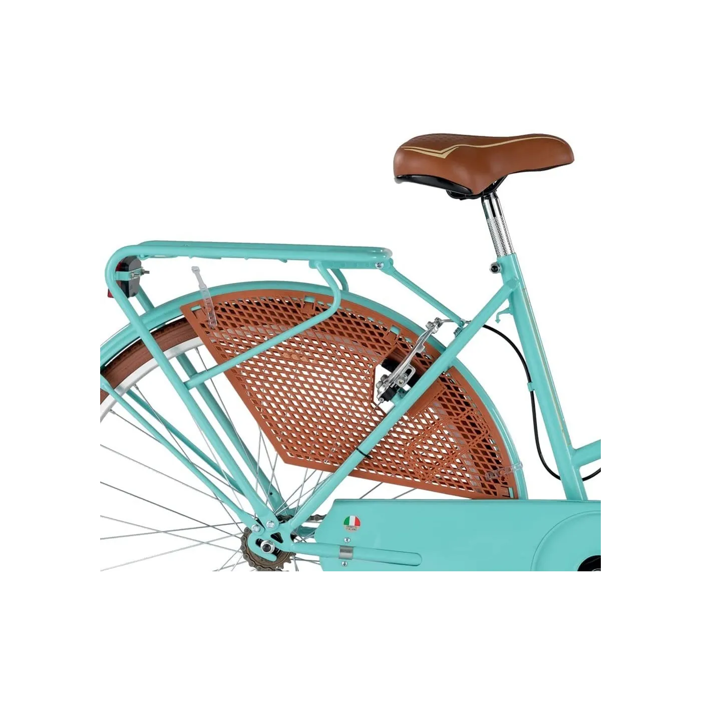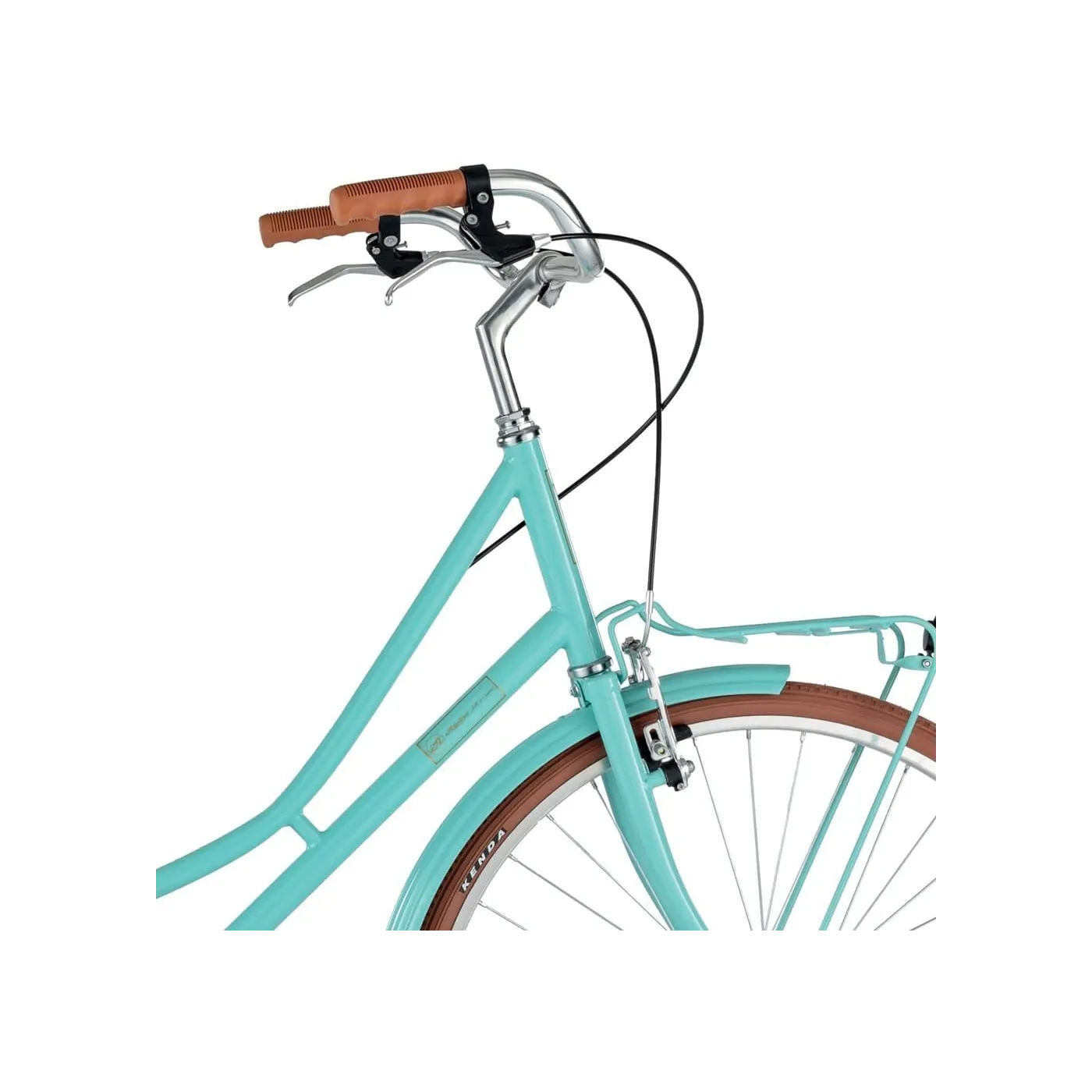 Idealnie dopracowane detale, sprawiają, że Alpina zauroczy wszystkich. Rower posiada dwa hamulce V-brake, profilowaną kierownicę w stylu retro, szerokie, wygodne siodełko, dwa bagażniki i stylową osłonę na tylne koło. Wyposażony w światła zasilane bateryjnie zapewnia bezpieczeństwo podróży nawet po zmroku. Całość utrzymana jest w pastelowych kolorach, z mocnym akcentem brązu.