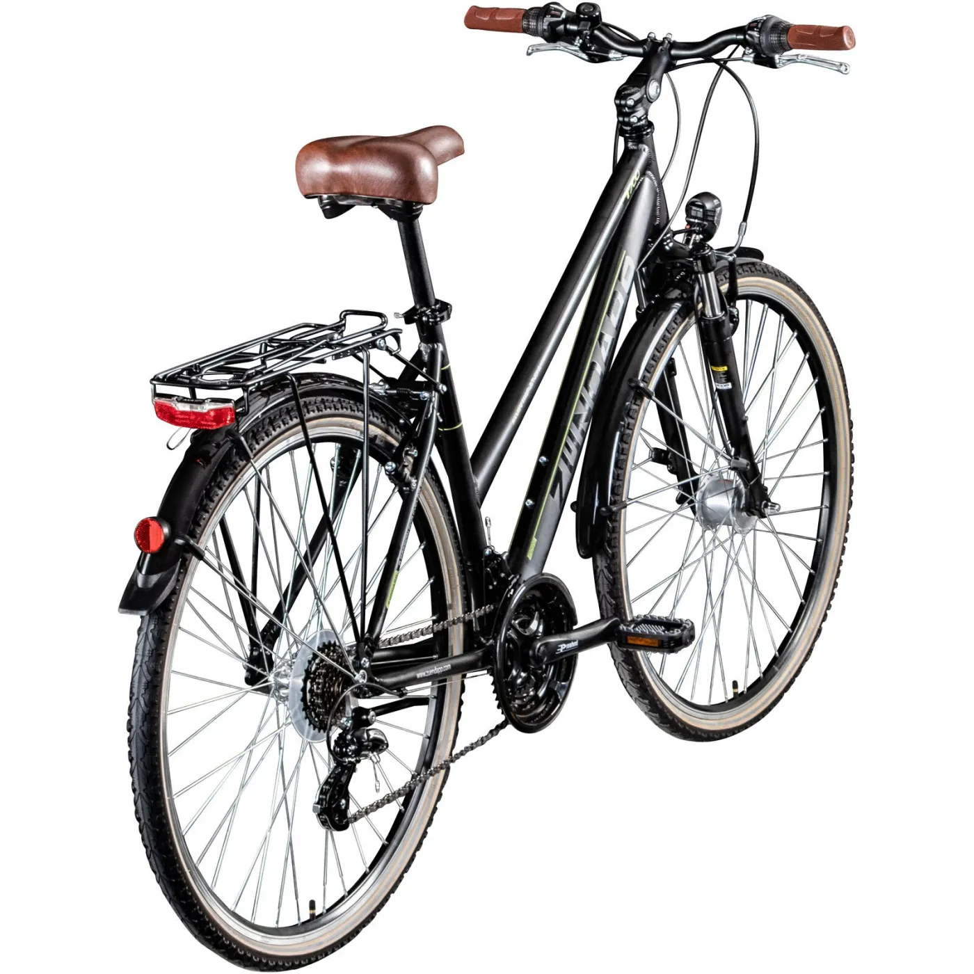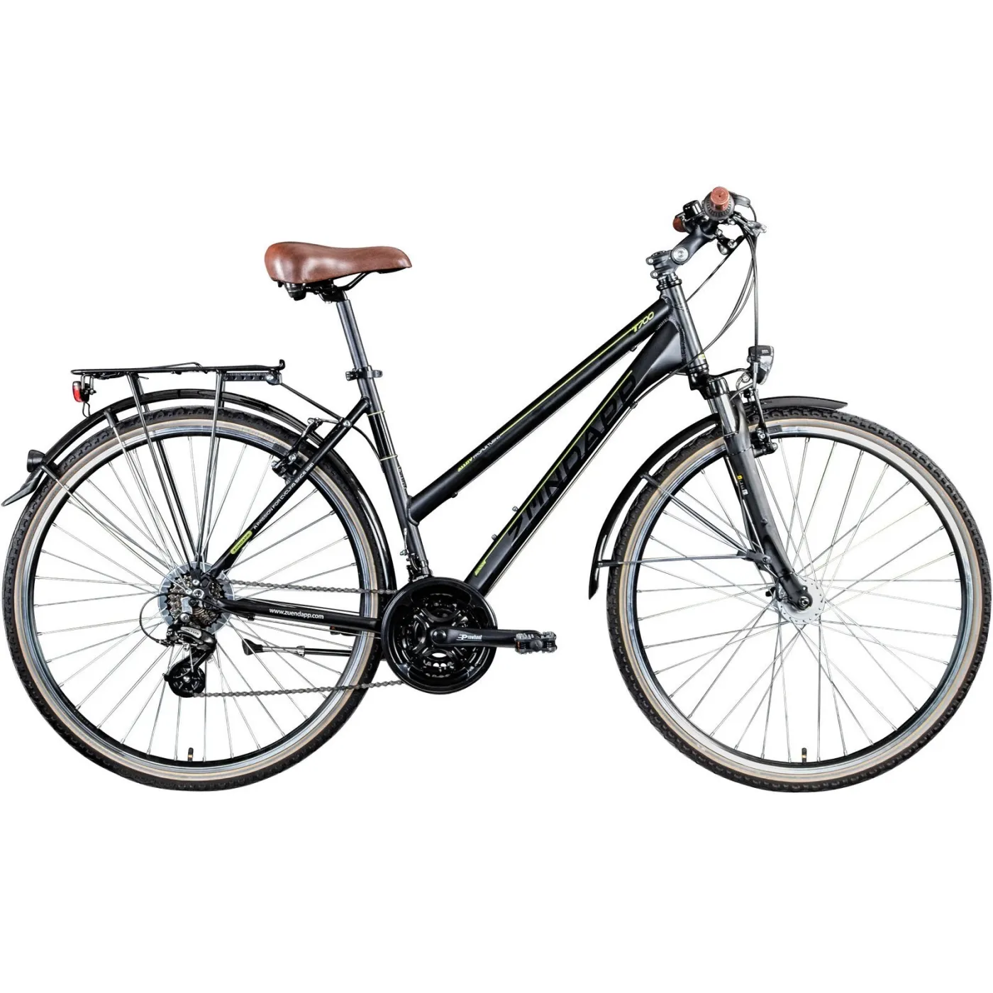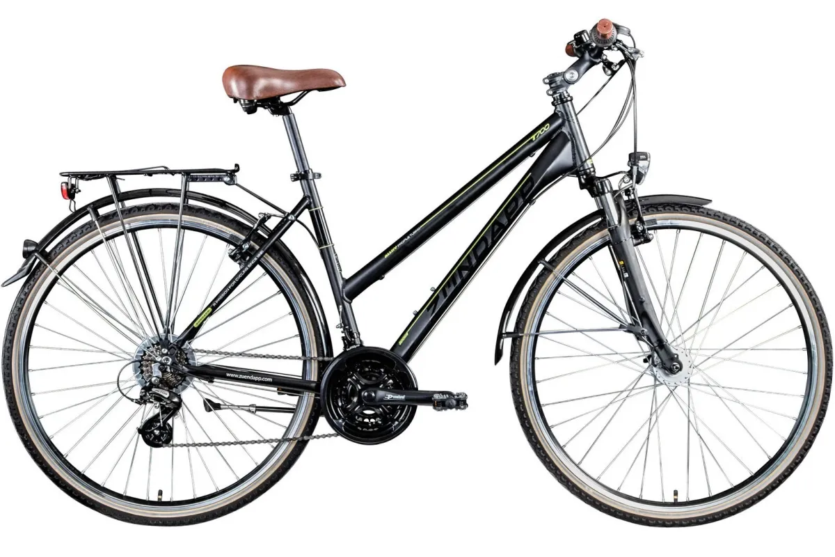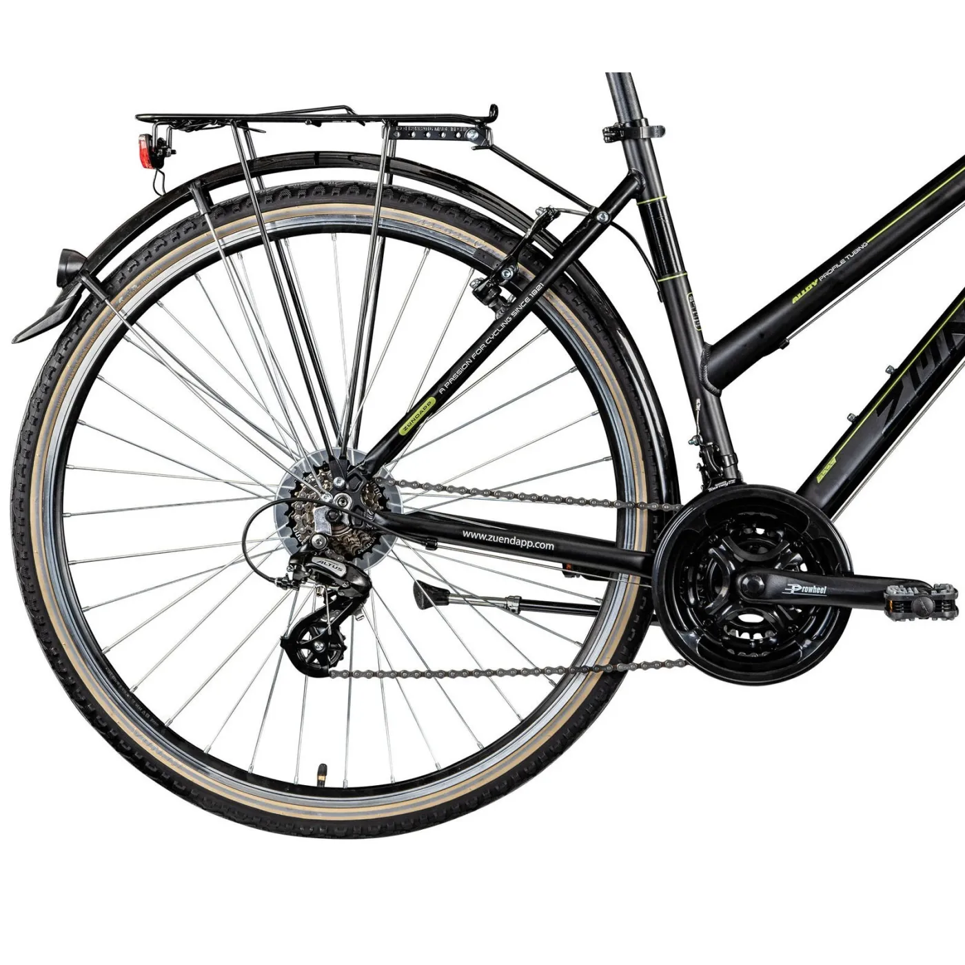 Rower jeździ na łatwych w prowadzeniu oponach o wymiarach 700c x 40c, których profil pozwala na dużą prędkość na asfalcie i nadal zapewnia wystarczającą przyczepność na zakrętach. Zündapp T700 ma szeroką gamę funkcji, dzięki czemu możesz natychmiast rozpocząć jazdę i nie musisz kupować dodatkowych akcesoriów. Oprócz osłon łańcucha, błotników, stopki bocznej i praktycznego bagażnika, szczególnie ważne jest oświetlenie, którego rower potrzebuje zgodnie z StVZO. Lampy są zasilane energią przez dynamo w piaście na przednim kole. Rower trekkingowy polecamy rowerzystom o wzroście od 160 do 180 cm.