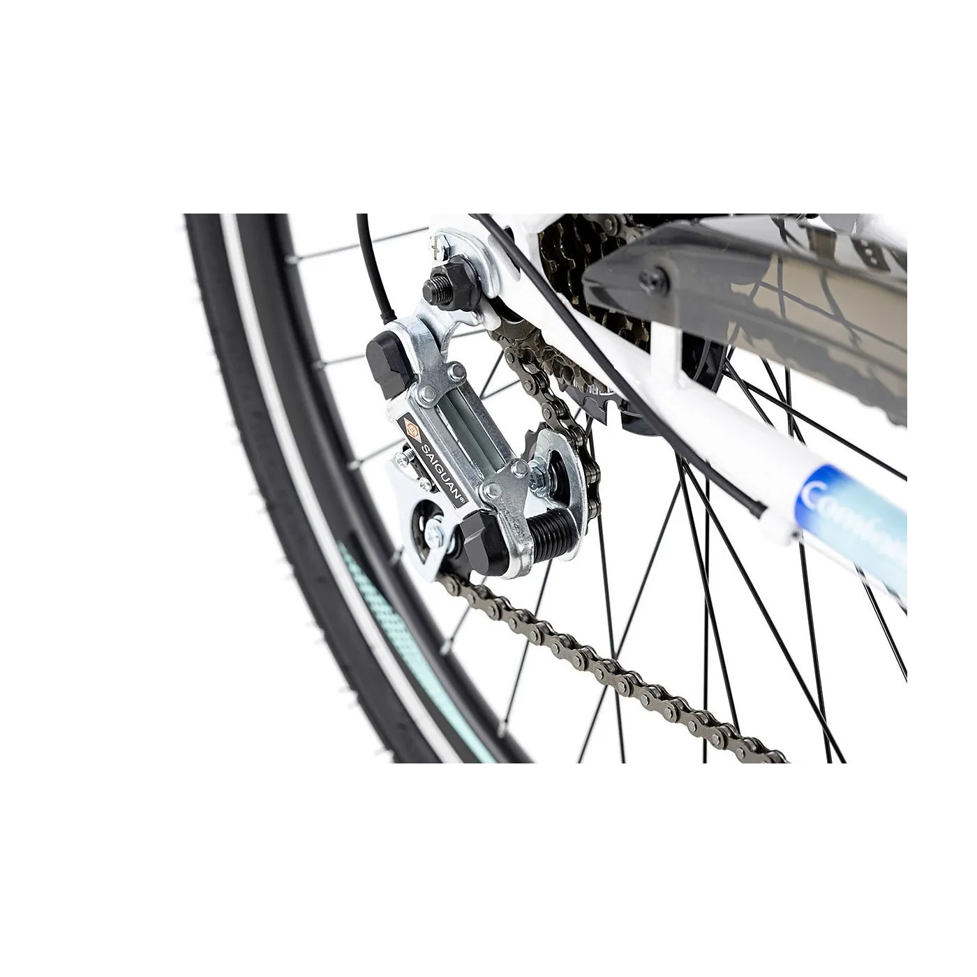 Rama w klasycznym białym kolorze oraz subtelne turkusowe naklejki sprawiają, że ten jednoślad przyciąga wzrok. Na praktycznym tylnym bagażniku oraz można bezpiecznie przewieźć zakupy czy bagaż podczas każdej przejażdżki.