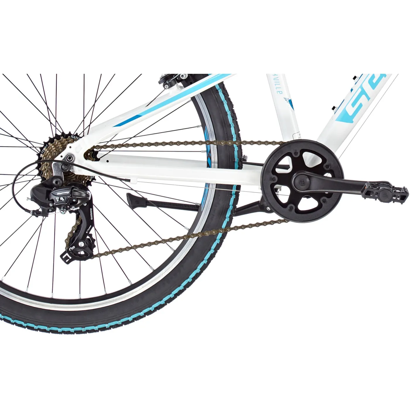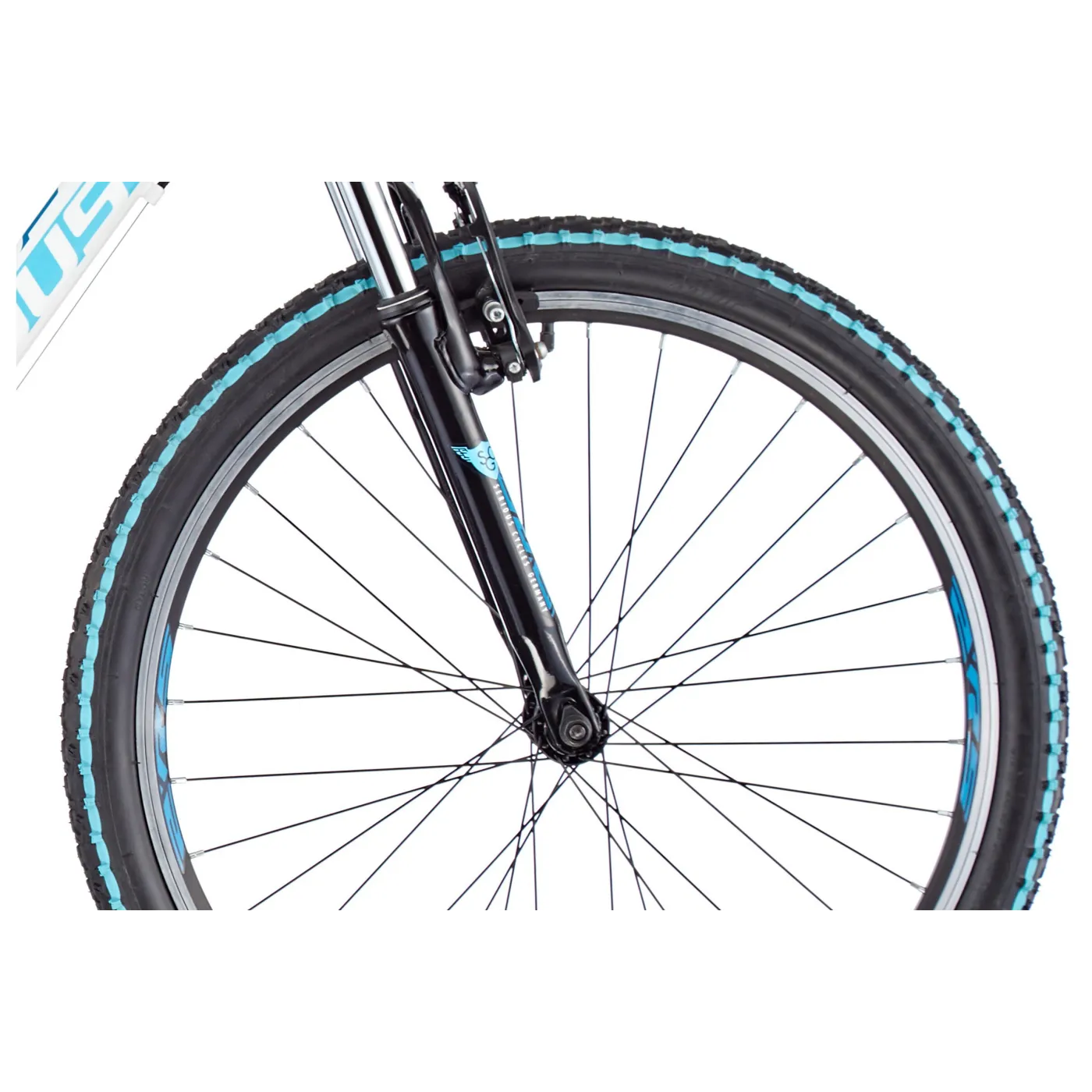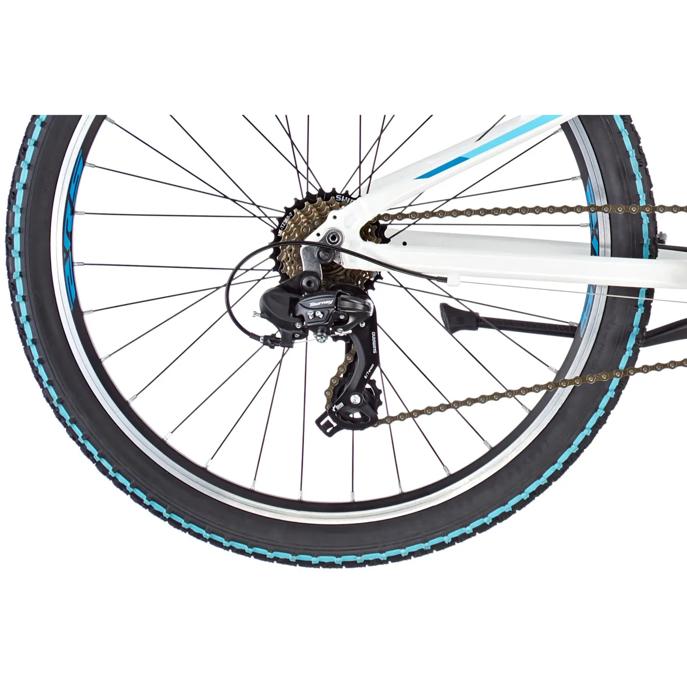 Młodzieżowy rower w biało niebieskiej kolorystyce posiada wygodne siodełko oraz ergonomiczną kierownice. Błyskawiczny system przerzutek tylnych SHIMANO Tourney oferuje 7 zróżnicowanych przełożeń, które sprawdzają się w trakcie podjazdów czy zjazdów, natomiast za bezpieczeństwo podczas jazdy młodszych użytkowników odpowiadają skuteczne hamulce V-brake, a także komfortowa geometria ramy, która ułatwia wsiadanie i umożliwia łatwe rozpoczęcie jazdy nawet dla dzieci o niższym wzroście.