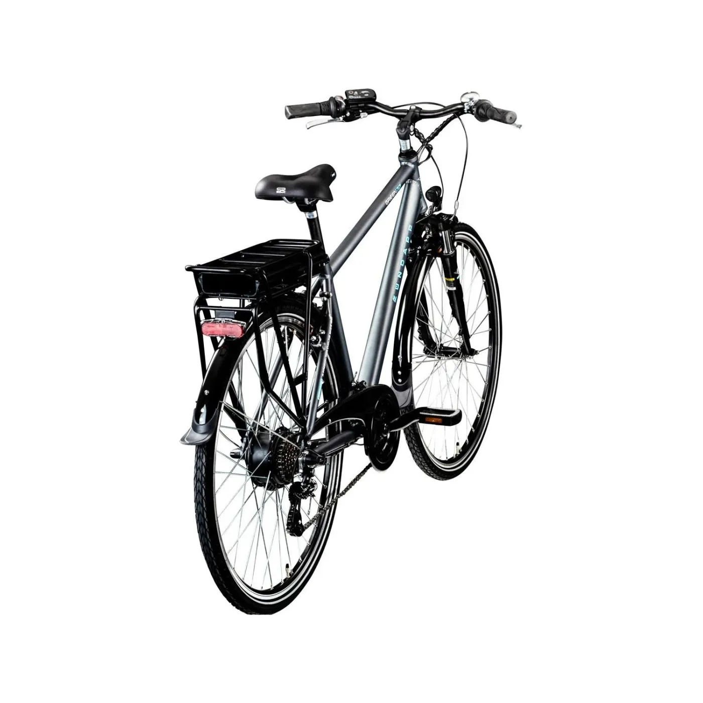 Podstawową konstrukcją e-roweru jest lekka rama diamentowa wykonana z aluminium, która jest połączona z widelcem amortyzowanym o skoku zawieszenia 63 mm. W połączeniu z kierownicą miejską z tylną korbą i mostkiem z regulacją kąta, rower zapewnia wygodną pozycję siedzącą, która pozwala jeździć przez długi czas bez objawów zmęczenia. Możesz też długo wytrzymać na wygodnym siodle.
