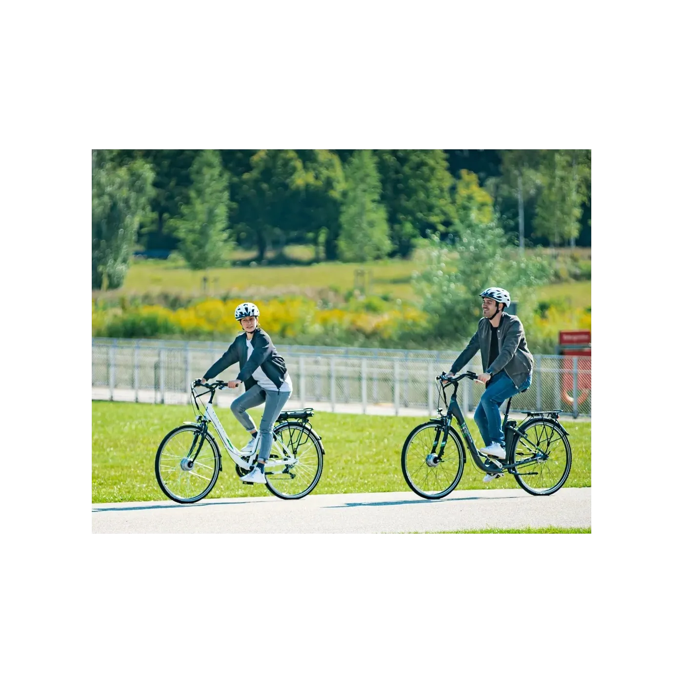 ⚖️ Podstawową konstrukcją tego roweru jest lekka aluminiowa rama. Niski przekrok ułatwia wyważenie roweru oraz bezproblemowe wsiadanie i zsiadanie z roweru. Nawet osoby o ograniczonej sprawności ruchowej mogą wygodnie korzystać z tego e-roweru. Pionowa pozycja siedząca, wspierana przez obróconą do tyłu kierownicę miejską, zapewnia dobrą widoczność na drodze i prawie Cię nie męczy.