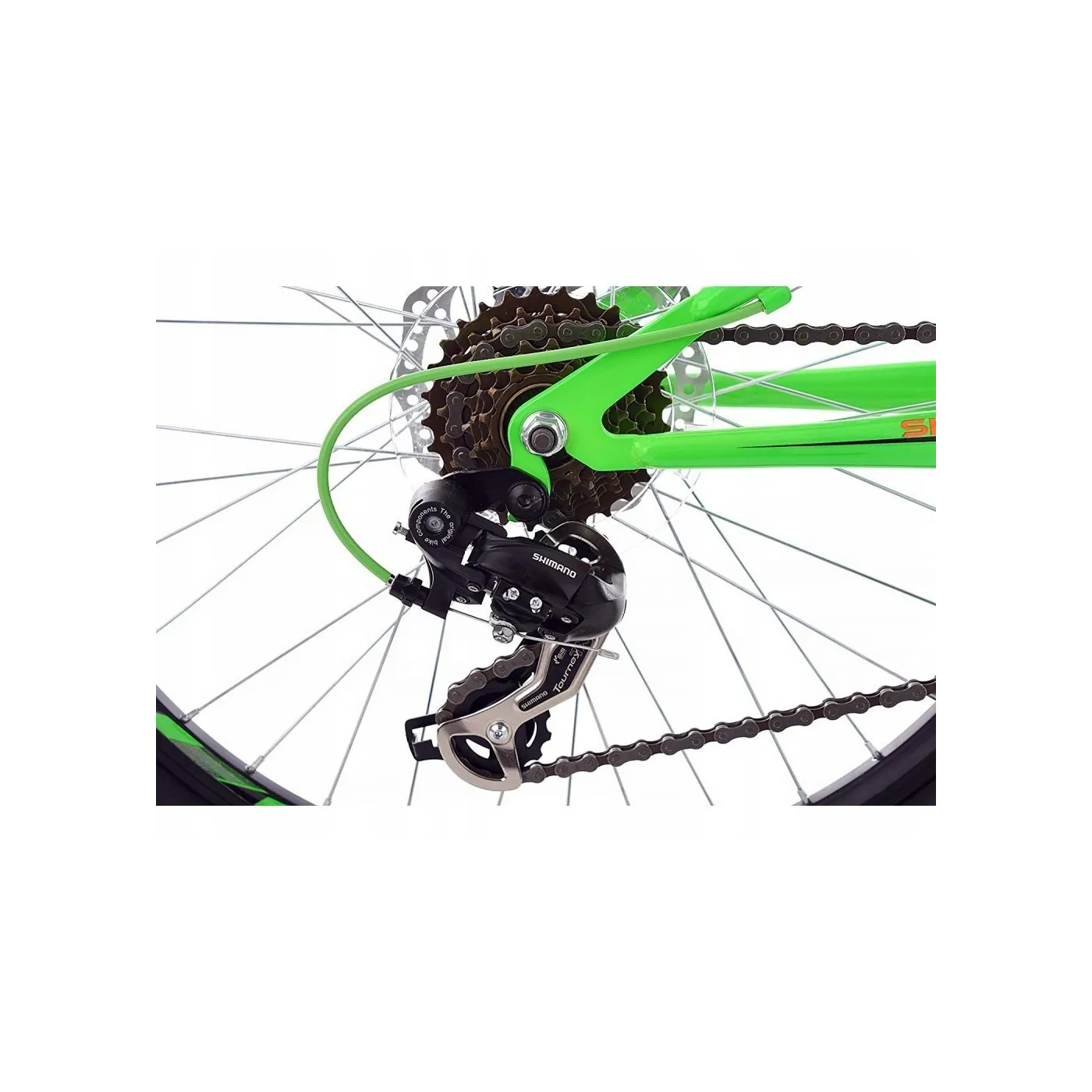 Rower w kolorze zielonym, który świetnie komponuję się z pomarańczowymi napisami, co z pewnością przypadnie do gustu każdemu chłopcu lubiącemu się wyróżniać. Solidna, amortyzowana rama gwarantuje pełen komfort jazdy nawet na bardzo nierównej powierzchni. Góral posiada dwa mechaniczne hamulce tarczowe V-LUXE dbają o bezpieczeństwo użytkownika, niezależnie od podłoża oraz warunków atmosferycznych.