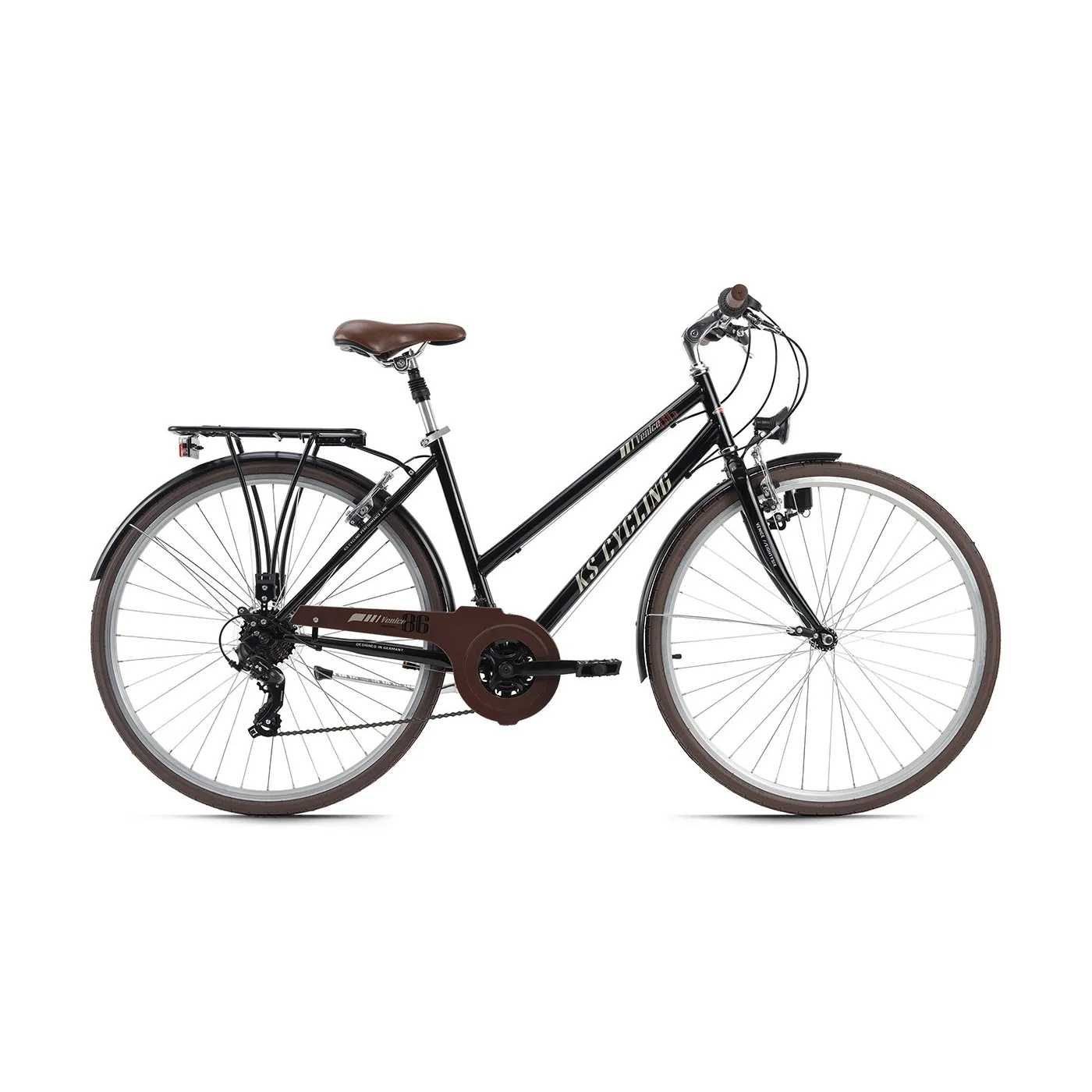 Niezależnie od tego, czy chcesz wygodnie jeździć po mieście, czy planujesz dłuższą wycieczkę: 28-calowy trekkingowy damski rower VENICE firmy KS Cycling jest zawsze z Tobą! Rower ma czarną ramę z eleganckimi detalami. Zawiera również opony, osłonę łańcucha, siodełko i uchwyty, które dopełniają wzór.