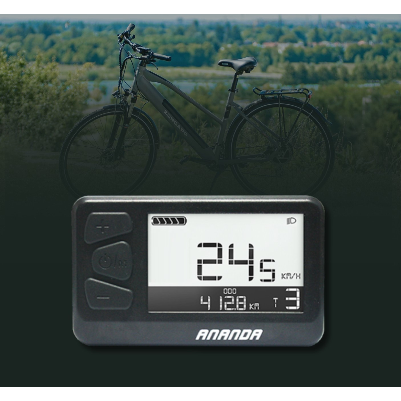 🔋 Mocny silnik piasty koła Ananda na tylnym kole zapewnia delikatne podparcie dzięki mocy 250 watów. Poziomy wsparcia są wybierane za pomocą przejrzystego wyświetlacza LCD Ananda D13, który zapewnia również pomoc w pchaniu i najważniejsze dane dotyczące jazdy. Ponieważ wyświetlacz znajduje się tuż obok lewego uchwytu, możesz go obsługiwać bez konieczności zdejmowania ręki z kierownicy. Dodatkowo, bateria o mocy 417,6Wh pozwoli Ci pokonać nawet do 125 km!