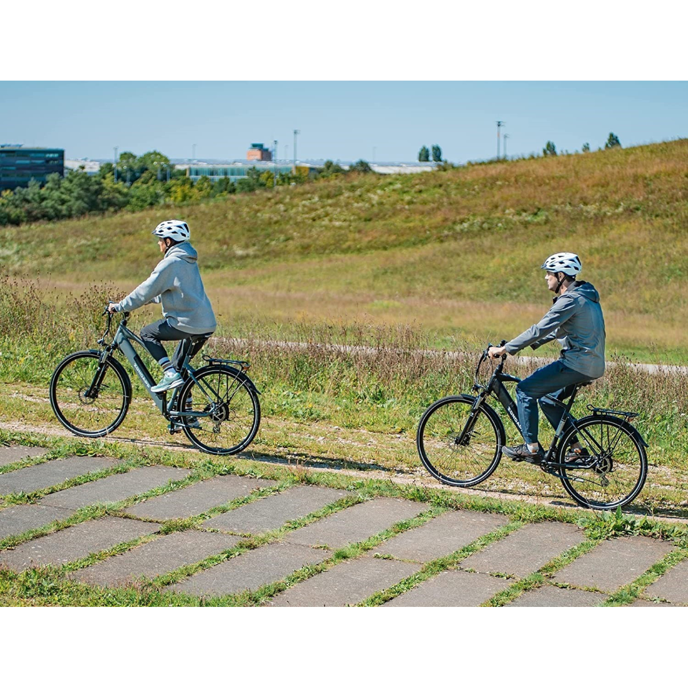 ⚖️Lekka trapezowa rama wykonana z aluminium zapewnia najlepsze właściwości jezdne i całkowicie ukrywa akumulator w dolnej rurze. Tutaj jest optymalnie chroniony przed brudem i kradzieżą. W podwoziu zainstalowano widelec amortyzowany SR Suntour SF14 NEX DS MLO o skoku 63 mm, który można zablokować za pomocą blokady podczas jazdy pod górę i można go dostosować do własnych potrzeb dzięki regulowanemu naprężeniu wstępnemu. Regulowany pod kątem wspornik kierownicy umożliwia precyzyjne dopasowanie pozycji kierownicy do kierowcy. Sama kierownica ma szerokość 610 mm i przesunięcie o 33°, co nie męczy nadgarstków podczas długich podróży.