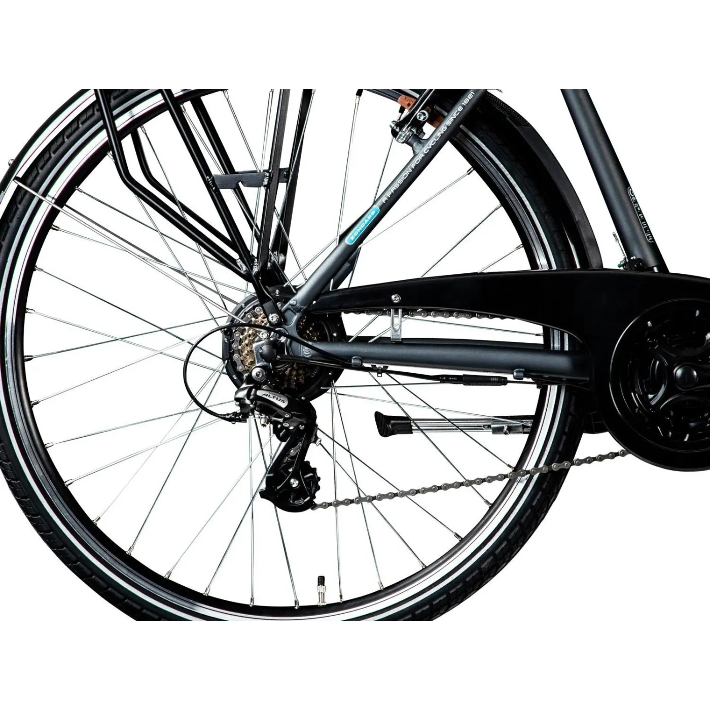 Podstawową konstrukcją e-roweru jest lekka rama diamentowa wykonana z aluminium, która jest połączona z widelcem amortyzowanym o skoku zawieszenia 63 mm. W połączeniu z kierownicą miejską z tylną korbą i mostkiem z regulacją kąta, rower zapewnia wygodną pozycję siedzącą, która pozwala jeździć przez długi czas bez objawów zmęczenia. Możesz też długo wytrzymać na wygodnym siodle.