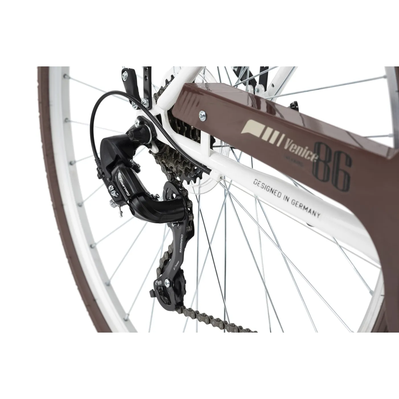 Niezależnie od tego, czy chcesz wygodnie jeździć po mieście, czy planujesz dłuższą wycieczkę: 28-calowy trekkingowy damski rower VENICE firmy KS Cycling jest zawsze z Tobą! Rower ma białą ramę z eleganckimi detalami. Zawiera również opony, osłonę łańcucha, siodełko i uchwyty w tym samym kolorze i dopełniają wzór.