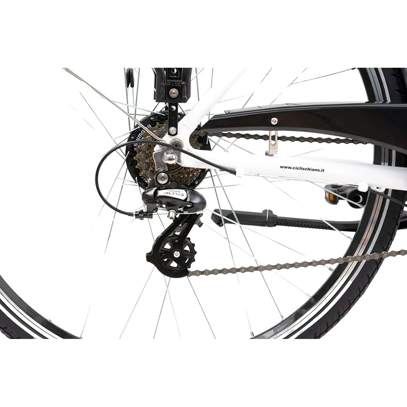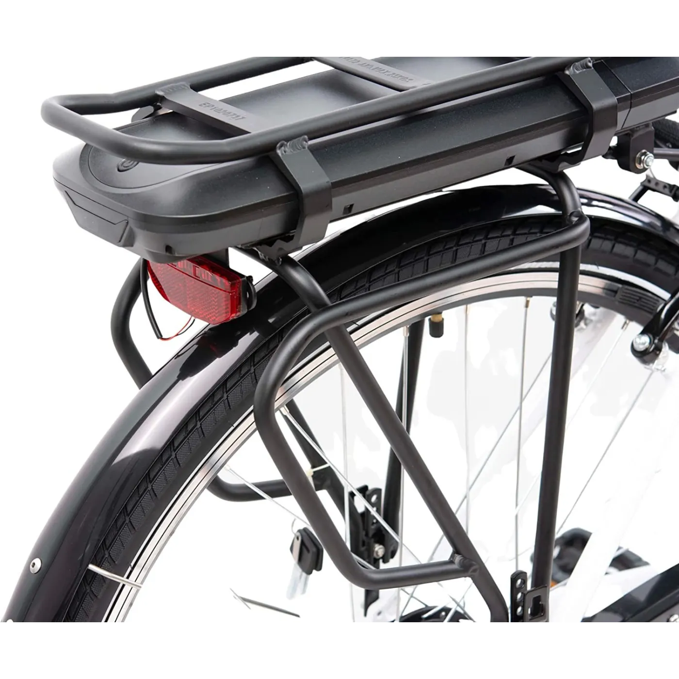 Silnik o mocy 250W oraz akumulator o pojemności 10,4Ah pozwala na pokonanie nawet do 90 km! (w zależności od wagi użytkownika, warunków i trybu jazdy). Bateria umieszczona jest pod bagażnikiem, dzięki czemu rower nie traci miejsca do transportu bagażu. Dodatkowym atutem jest komfortowa pozycja jazdy, którą zapewnia wygodne siodełko i szeroka kierownica. Rower wyposażony jest w 21 biegów, co ułatwia podróżowanie po zróżnicowanym terenie oraz dwa hamulce V-brake. E-Ride posiada wszystkie potrzebne akcesoria, tj. błotniki, bagażnik, stopkę i oświetlenie oraz dzwonek - zapewniając tym bezpieczeństwo jazdy.