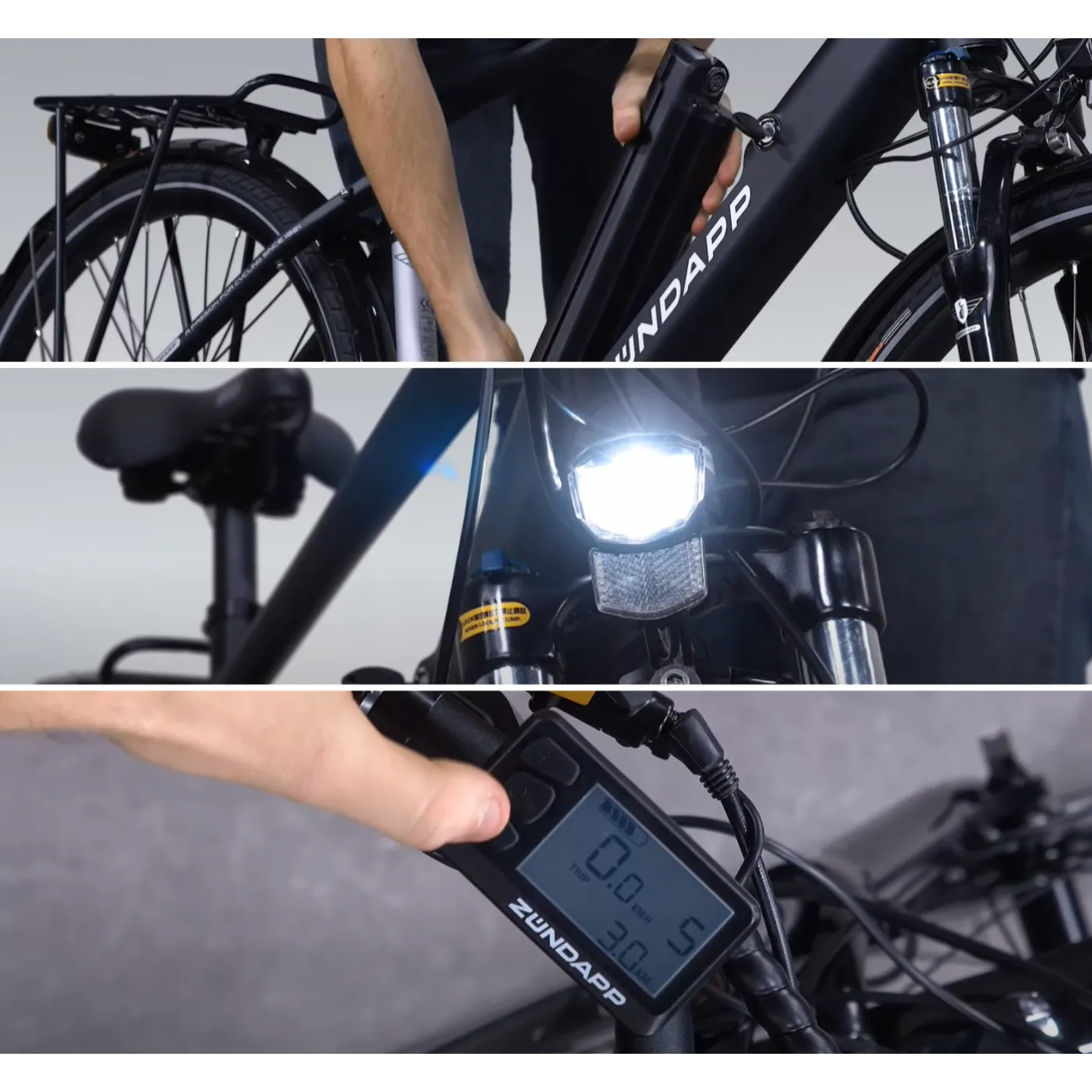 💡 Jako rower na co dzień Zündapp Z810 jest już doskonale wyposażony. Oświetlenie AXA z przodu i z tyłu sprawia, że e-rower nadaje się do ruchu drogowego. Błotniki chronią przed brudem drogowym, a osłona łańcucha zapobiega zaplątaniu się odzieży w łańcuch.