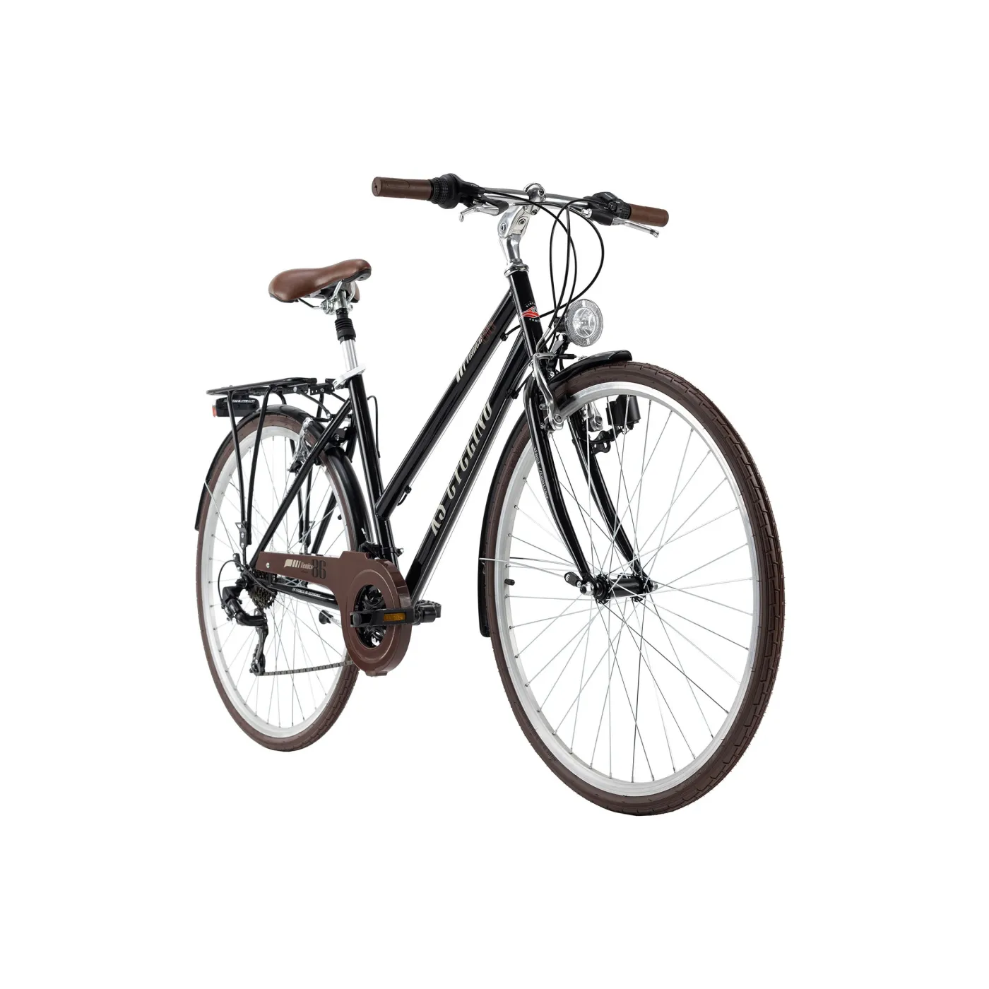 Niezależnie od tego, czy chcesz wygodnie jeździć po mieście, czy planujesz dłuższą wycieczkę: 28-calowy trekkingowy damski rower VENICE firmy KS Cycling jest zawsze z Tobą! Rower ma elegancką czarną ramę, zawiera również opony, osłonę łańcucha, siodełko i uchwyty, które dopełniają wzór.