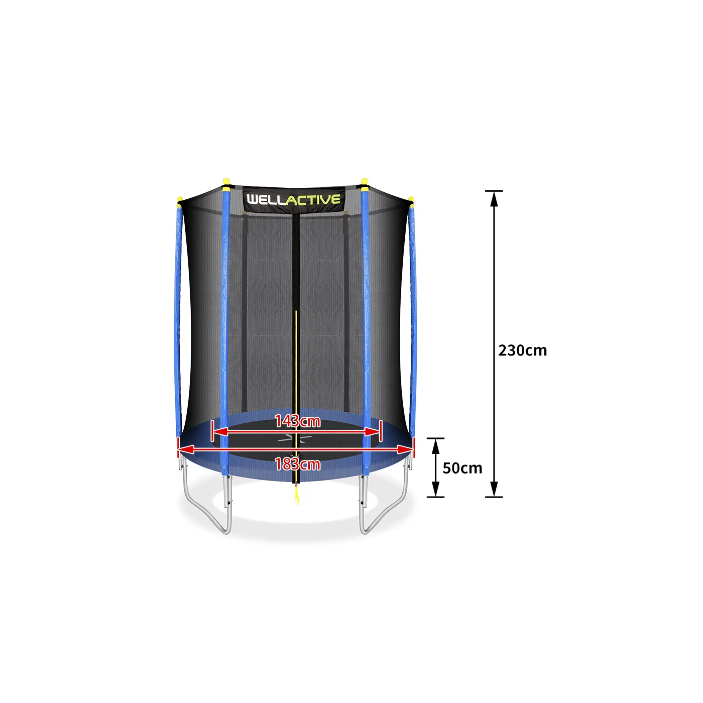 Średnica maty to 146 cm - oferuje sport, gry i zabawę zarówno dzieciom, jak i dorosłym. W zestawie siatka zabezpieczająca i wyściółka ramy.