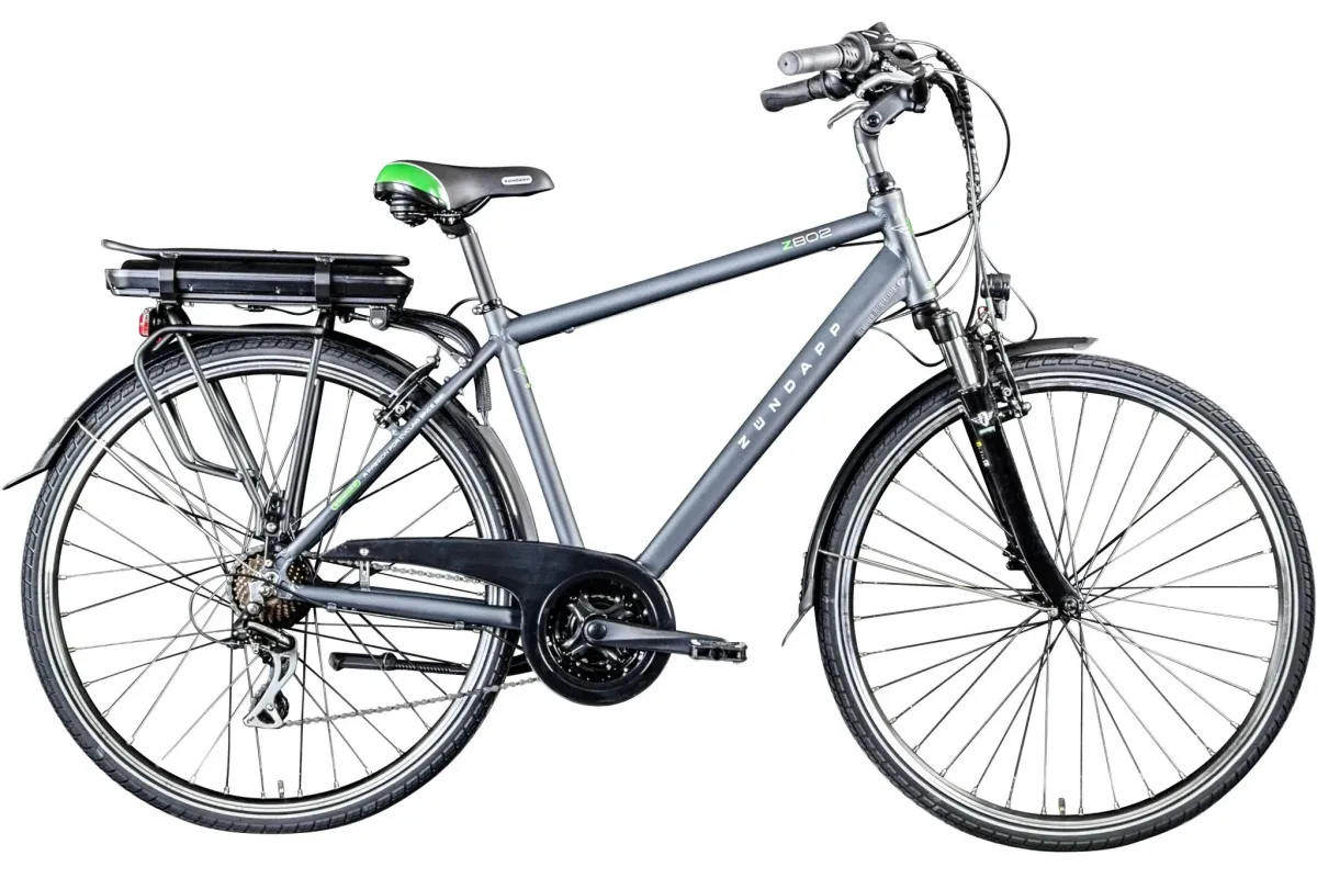 Zundapp Z802 to e-rower wprost idealny zarówno na długie wycieczki, jak i na co dzień i nigdy Cię nie zawiedzie. Podstawową konstrukcją e-roweru jest lekka aluminiowa rama diamentowa połączona z amortyzowanym widelcem o skoku 63 mm. W połączeniu z wygiętą do tyłu miejską kierownicą i mostkiem z regulacją kąta, rower zapewnia wygodną pozycję siedzącą, która pozwala na długą jazdę bez oznak zmęczenia. Napęd elektryczny z silnikiem piasty koła wspiera Cię mocą 250 watów do prędkości 25 km/h. Z baterią bagażnika 374.4 Wh możesz przejechać od 30 do 100 km.
